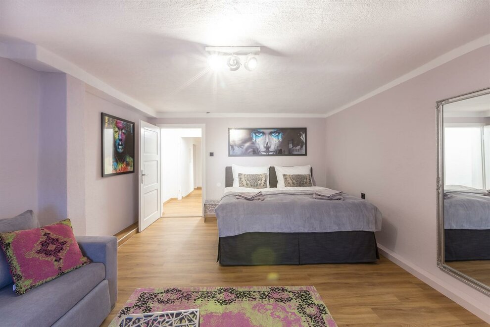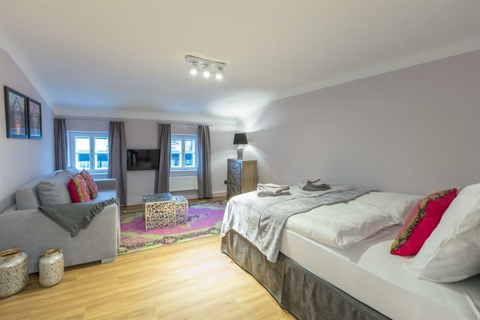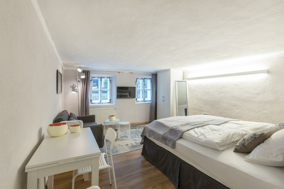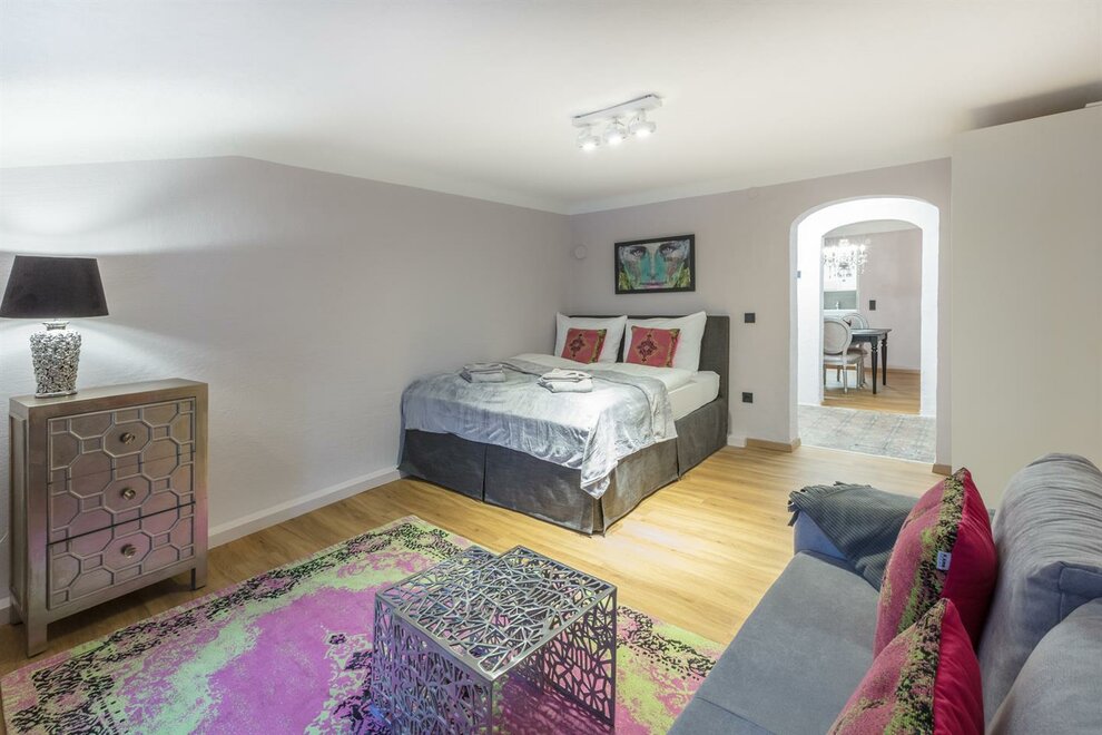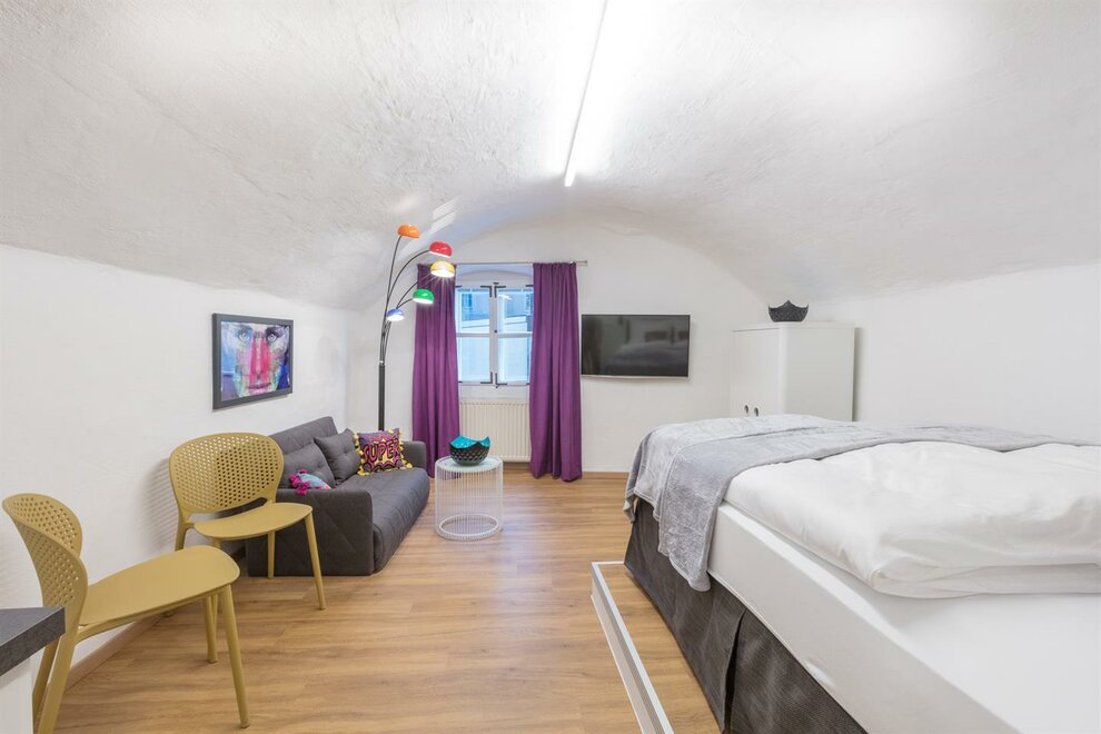 Dům postavený v roce 1540, historický a chráněný památkou, se skládá z 5 kompletně zrenovovaných a pečlivě navržených apartmánů a společné střešní terasy, která je přístupná všem a nabízí úžasný výhled přímo na pevnost a přes salcburské Staré Město. Díky centrální poloze se Stein-Lodge nachází jen kousek od většiny památek, jako jsou pevnost, salcburská katedrála, Mozartův rodný dům, Mirabellplatz, festivalový dům a ulice Getreidegasse. Stein Lodge se nachází v historické Steingasse a spojuje historickou atmosféru s moderním designem, podpořeným 25 uměleckými tisky současného umělce Jürgena Fuxe, které zdobí chráněný dům. Vzhledem k historické struktuře budovy nemá Stein-Lodge výtah, má variabilní výšky stropů a je vybaven historickými chráněnými dveřmi a okny. Moderně zrenovované prostory, přímo na skále Kapucínské hory, které jsou částečně viditelné i v budově, stejně jako umělecká díla, dodávají apartmánům jejich jedinečný kouzlo. Volně přístupná střešní terasa, s jedinečným výhledem na pevnost a Staré Město, doplňuje mimořádnou atmosféru Stein-Lodge. Steingasse se nachází přímo v srdci salcburského Starého Města a je ideálním výchozím bodem pro prohlídku památek, restaurace, nákupy a mnoho dalšího. Ubytování je zvláště vhodné pro páry, jednotlivce, obchodní cestující, rodiny a skupiny. Díky centrální poloze se dostanete k salcburské katedrále za 400m, Mozartovu rodnému domu za 500 m, ulici Getreidegasse za 600 m a pevnosti za 800 m. Snadno a rychle pěšky. Apartmány Stein-Lodge nabízejí: Zdarma ručníky a ložní prádlo Kompaktní kuchyni s mikrovlnnou troubou s grilem, toustovačem, sklokeramickou deskou, ledničkou, kávovarem Cremesso, nádobím, příbory, sklenicemi a hrnci Fén Zdarma vysokorychlostní internet Kabelovou TV a reproduktory s dokovací stanicí Žehličku (na vyžádání) Dětskou vysokou židli zdarma (na vyžádání) Dětskou postýlku zdarma (na vyžádání) Všichni naši hosté mají přístup k: Střešní terase včetně jedinečného výhledu Bezplatnému používání pračky a sušičky Bezplatnému používání bicyklů