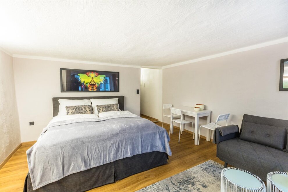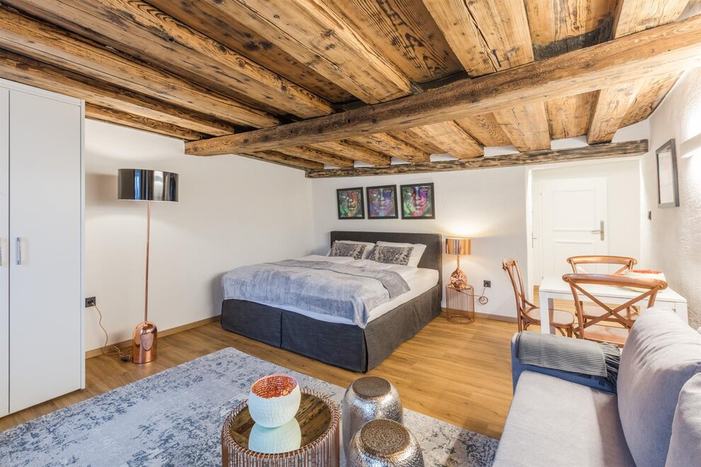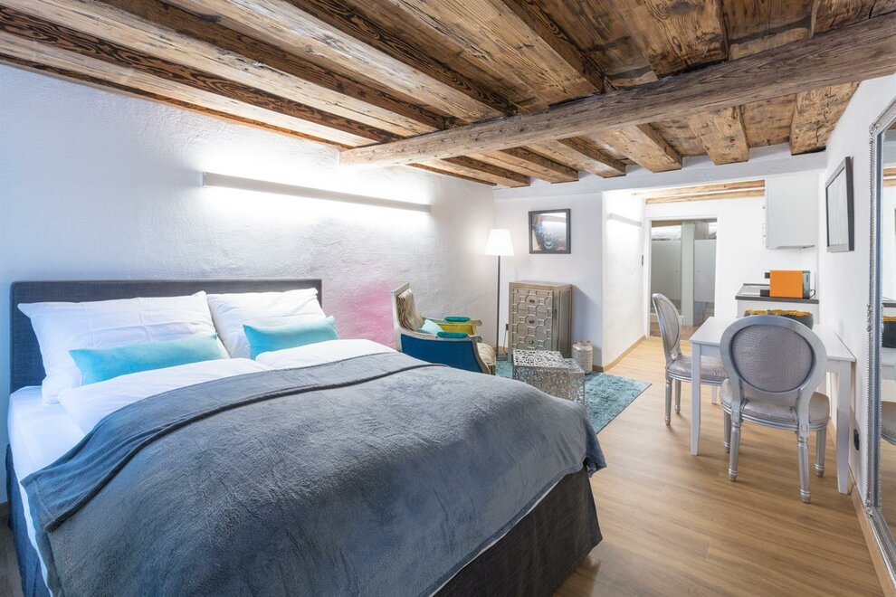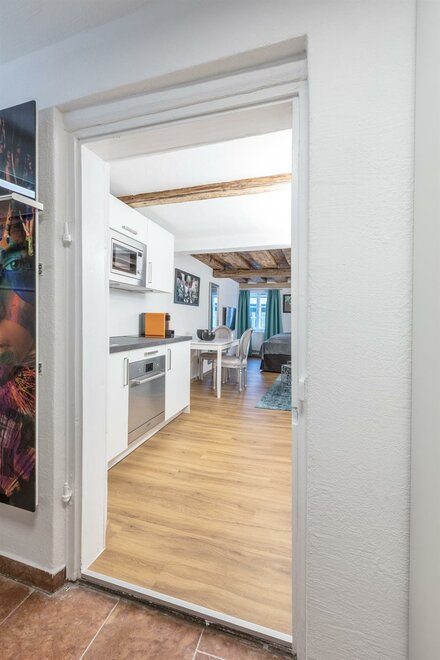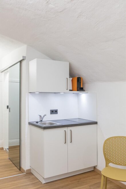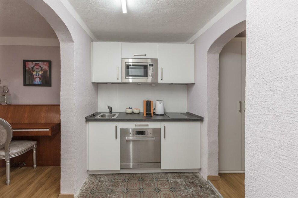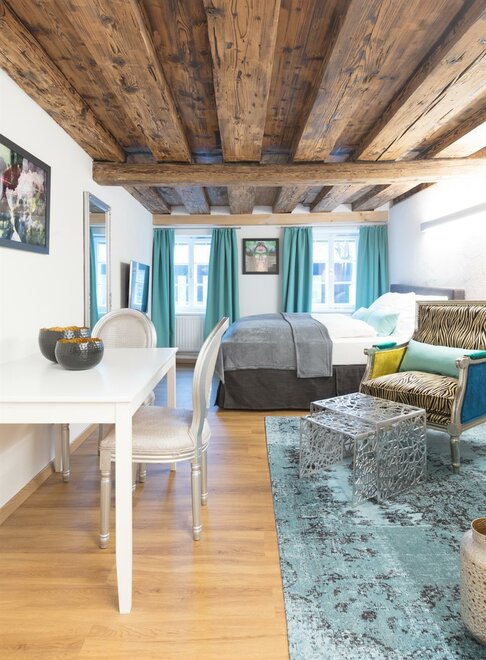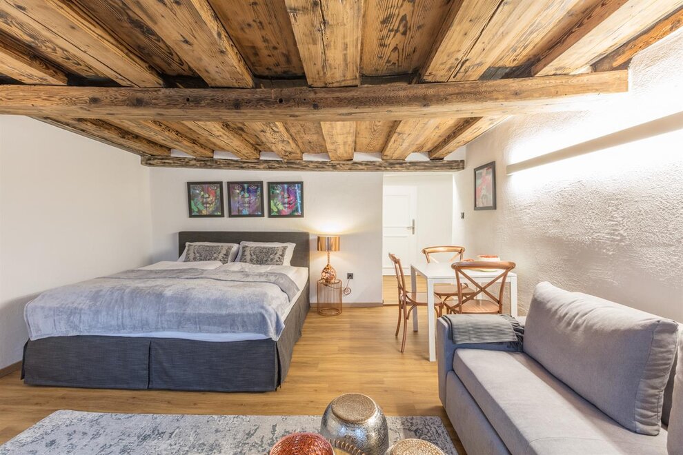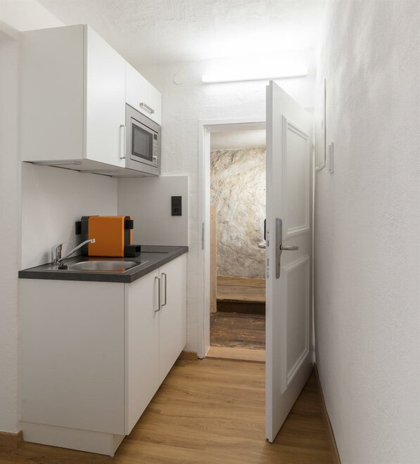 ZELENÝ POKOJ je exkluzivní studio s jedinečnou atmosférou. Na přibližně 30m² si užijete volný výhled na pevnost nebo příjemnou sprchu přímo před kamenem Kapucínské hory. Studio má koupelnu o rozloze 9m² s vyhřívaným sprchovým koutem, WC a umyvadlem. Obývací ložnice zahrnuje manželskou postel typu boxspring, stůl se 2 židlemi a čtecí křeslo se stojací lampou. Kompaktní kuchyň je plně vybavena mikrovlnnou troubou, lednicí, sklokeramickou varnou deskou a kávovarem Cremesso.