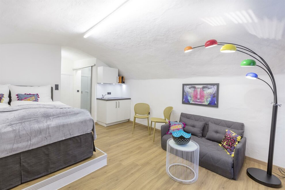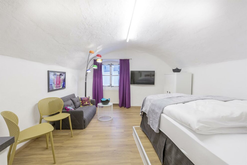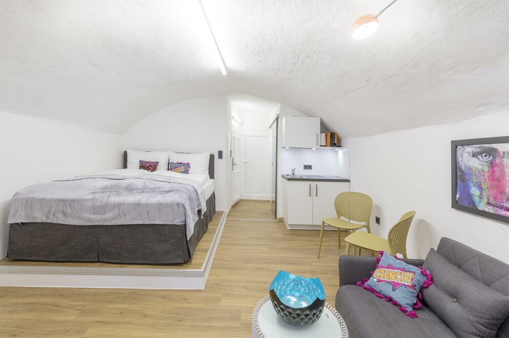 Barevné POPART Studio má asi 22 m², nachází se v 1. patře Stein Lodge a nabízí výhled na historickou Steingasse. Pokoj je láskyplně zařízen manželskou postelí s boxspringem, stolem se 3 židlemi a křeslem s konferenčním stolkem. Kompaktní kuchyň je vybavena varnou deskou a kávovarem. Koupelna má sprchu, toaletu a umyvadlo.