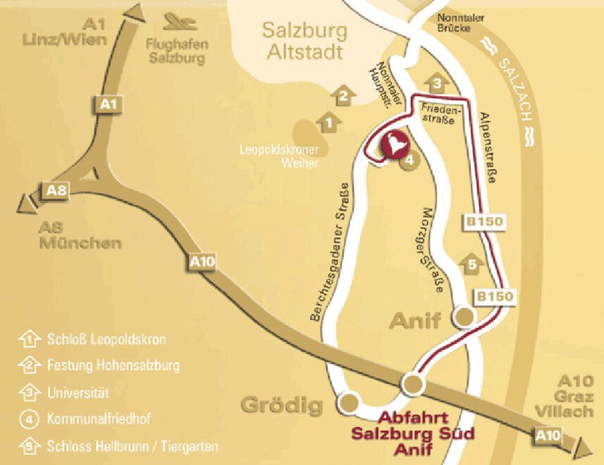 Coming on the highway (A 10 from Italy/Germany or A1 from Linz/Vienna etc.,) please take the exit Salzburg Süd, follow the four-lane main road, after approx. 500 m there is a sign on the right with the inscription "HOTELROUTE" (yellow), follow this "yellow hotel route" until you reach ****-Hotel Hölle.
