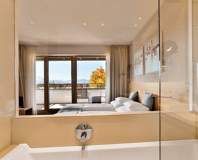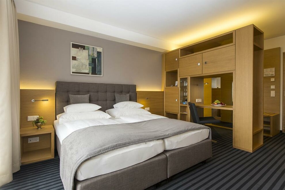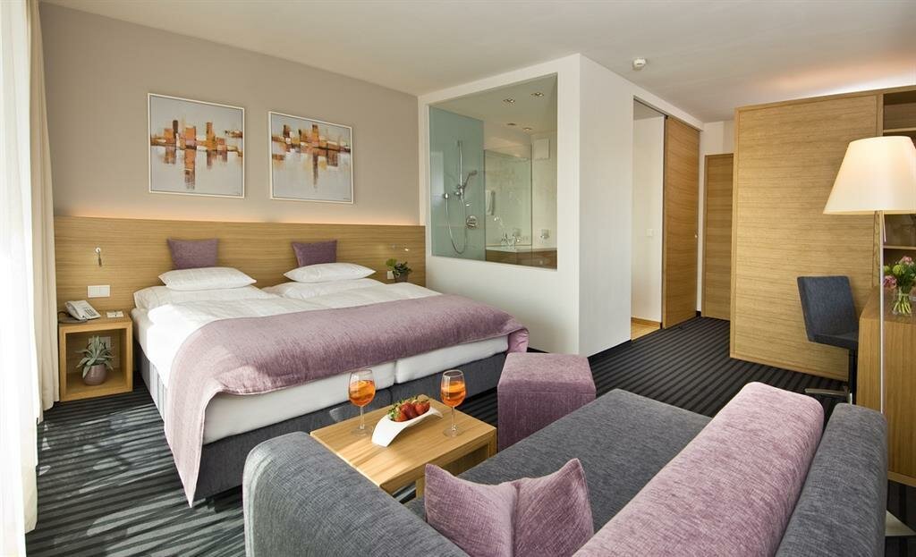 Modern, sleek furnishings with stylish decorations in lavender or taupe The spacious rooms with high-quality furnishings boast a combination of modern design and cosy atmosphere. Some of the rooms have a balcony. •Comfortable double bed - 180cm wide •Spa bath or shower, separate toilet, hairdryer, makeup mirror •Telephone •Flat-Screen TV (HDTV, cable) •Mini bar •Safe •Desk •partly Armchair or Sofa •Wireless internet •Air-conditioning, some rooms have a balcony