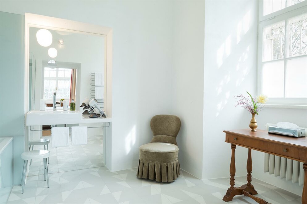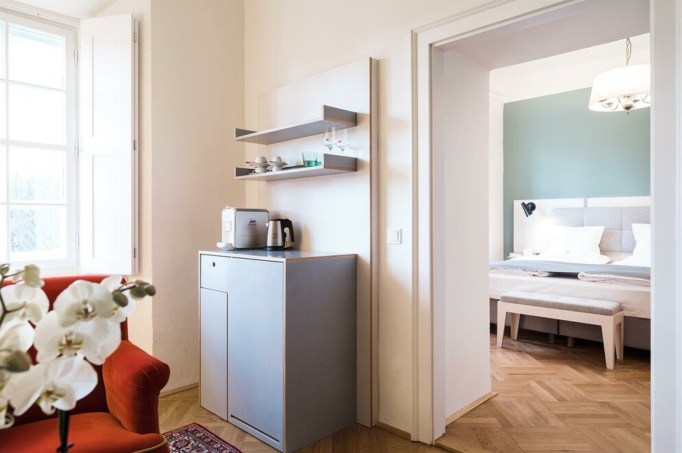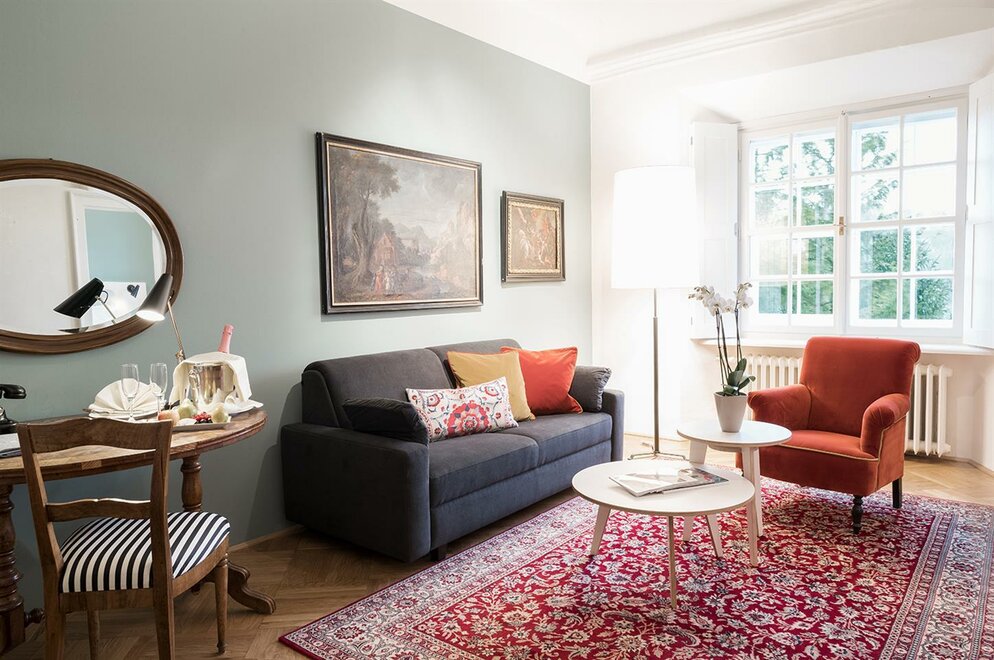 Our generously sized Superior Suites all have separate living and sleeping rooms and feature stunning views over the idyllic lake and majestic Untersberg mountain. On request Superior Suites can be connected with a Standard Suite. Daily breakfast is served in the elegant halls of the Schloss. - separate living and sleeping rooms - for 1-4 people (max. 2 adults + 2 children under the age of 16) - view over the idyllic lake and majestic Untersberg mountain - Daily breakfast is served in the elegant halls of the Schloss All suites are inclusive of a bottle of Prosecco, fresh fruit, and flowers on arrival, magazines, daily cake and coffee/tea in the Meierhof Café, full buffet breakfast served in the elegant halls of the Schloss, a bottle of mineral water, Wi-Fi, use of bicycles and the fitness center, mini golf, welcome drink (at the adjacent Weiher Wirt restaurant), parking, and access to the adjacent swimming pool (seasonal). Price per room and night (max. 2 adults + 2 children under the age of 16). Extra bed EUR 60,00 per night and person (max. age 16 years). Room facilities: Bathroom with shower or bathtub, Quality Hairdryer, Amenities, Bathrobe, Slippers, Flat Screen TV, Tlephone, Safe, Iron & Ironing board, Fridge Room Size: ca. 42 - 66 m² Bed Size: Double bed (180 x 200 cm)
