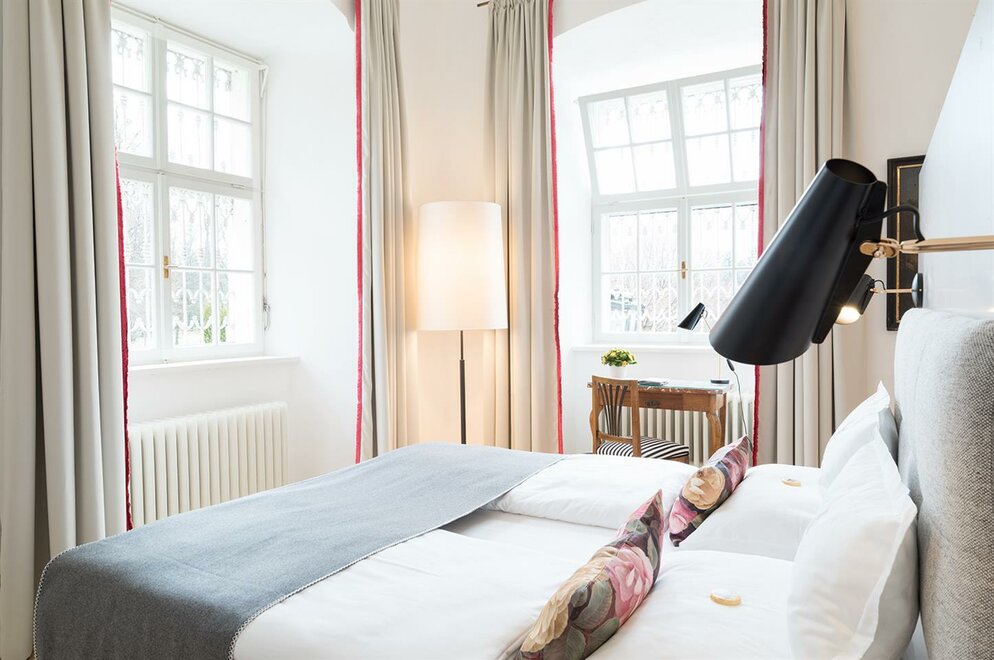 Standard single rooms are located in the Meierhof building adjacent to the Schloss, with views either over the quiet courtyard or the fortress Hohensalzburg. - for 1 person- view over courtyard or the fortress Hohensalzburg - Daily breakfast is served in the elegant halls of the SchlossAll rooms are inclusive of full buffet breakfast served in the elegant halls of the Schloss, a bottle of mineral water, Wi-Fi, use of bicycles and the fitness center, mini golf, parking, and access to the adjacent swimming pool (seasonal) Room facilities: Bathroom with shower or bathtub and toilet, Quality Hairdryer, Amenities, Telephone, 32 inch flat screen TV, SafeRoom size: 12 m² Bed Size: Single bed (120 x 200 cm)