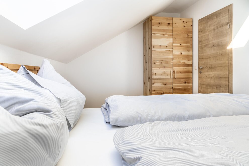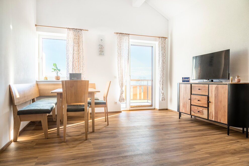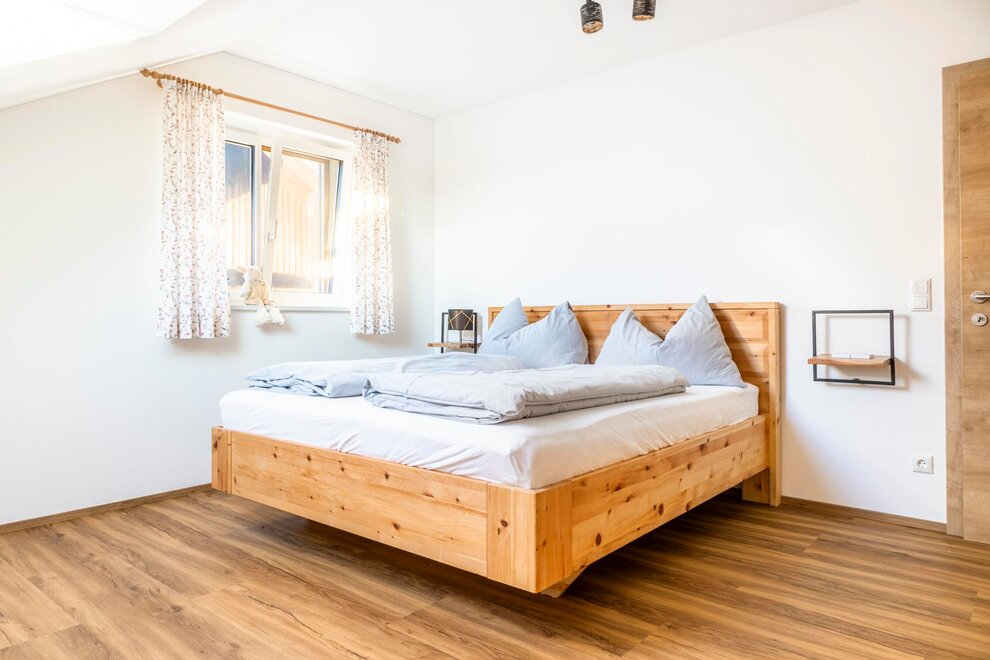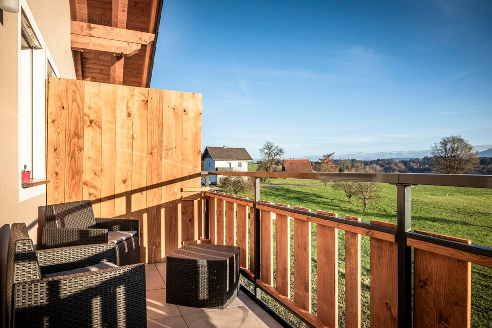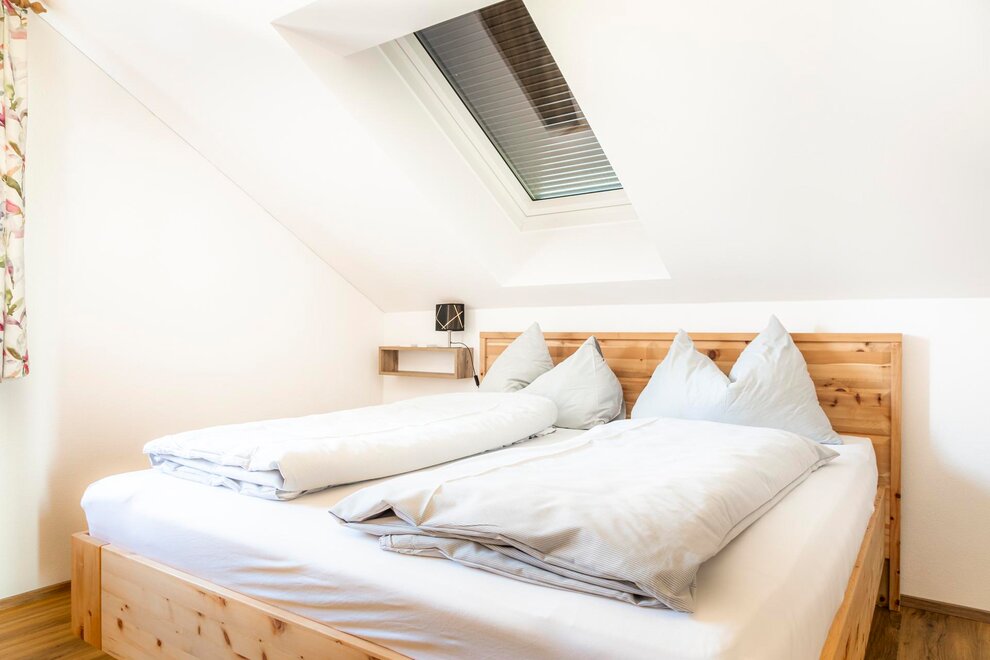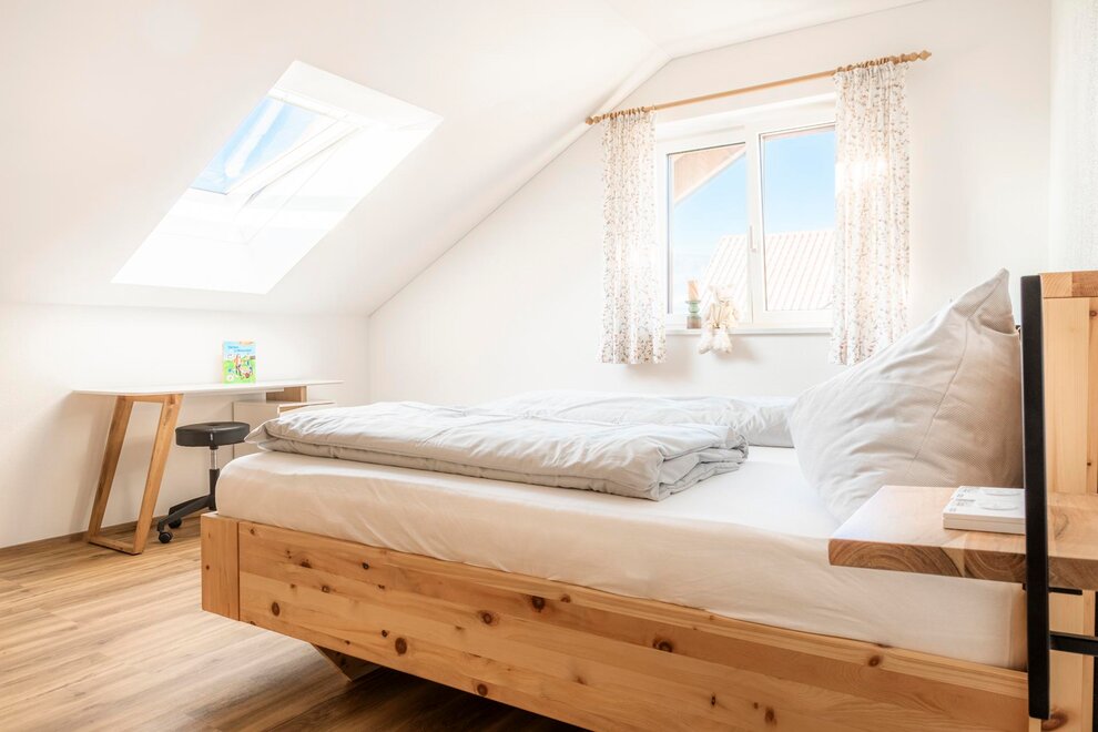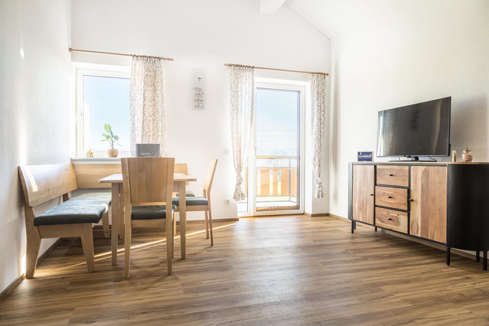 The holiday apartments are 65 m² and 55 m² in size. Each apartment features two bedrooms, a kitchen, a bathroom, a toilet, and a balcony with a view of our meadows and the mountains.
