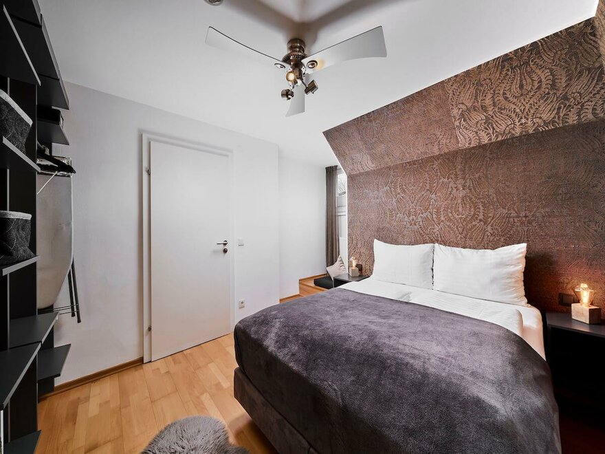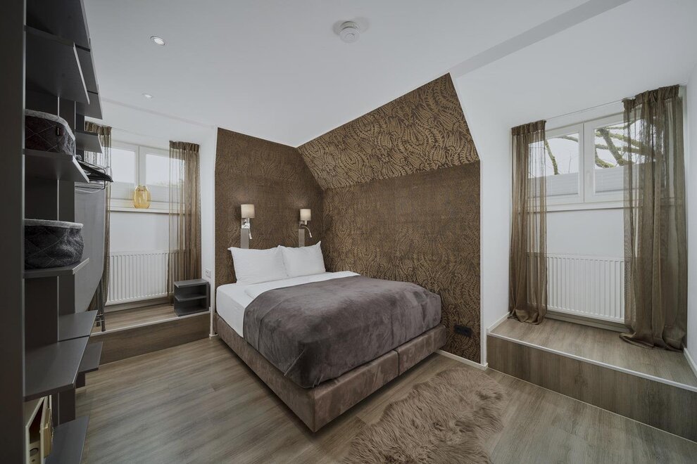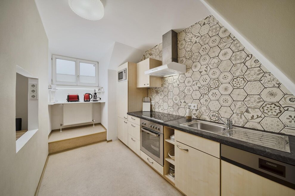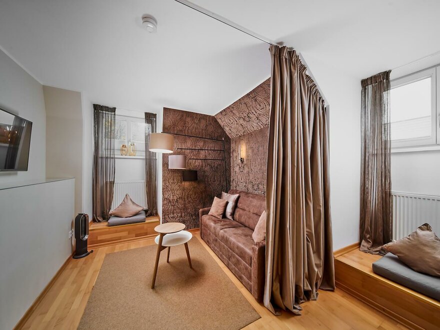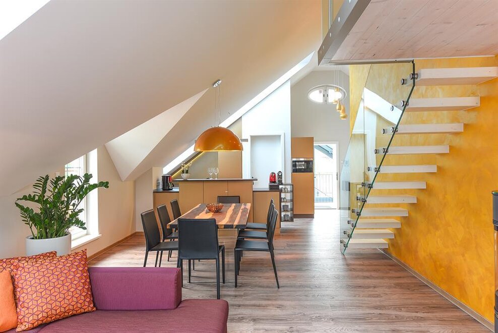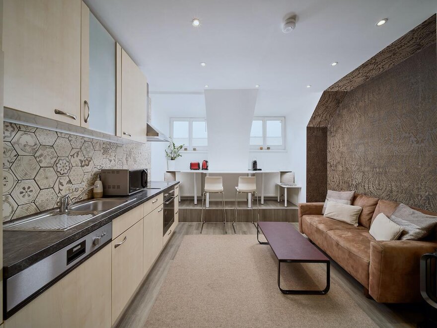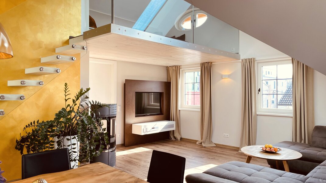 The Mozart 5 apartment is located in the attic and creates a unique living experience through individual details. The sloped ceilings and sandy tones immediately create a cozy atmosphere.