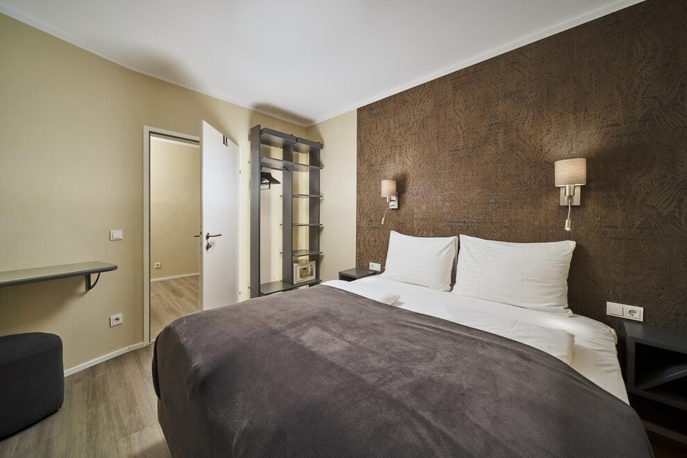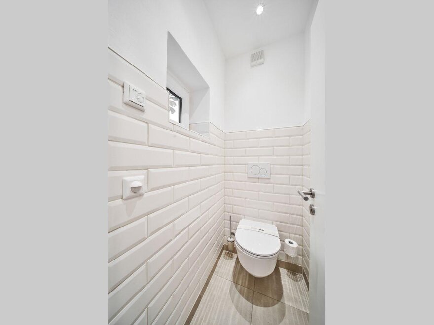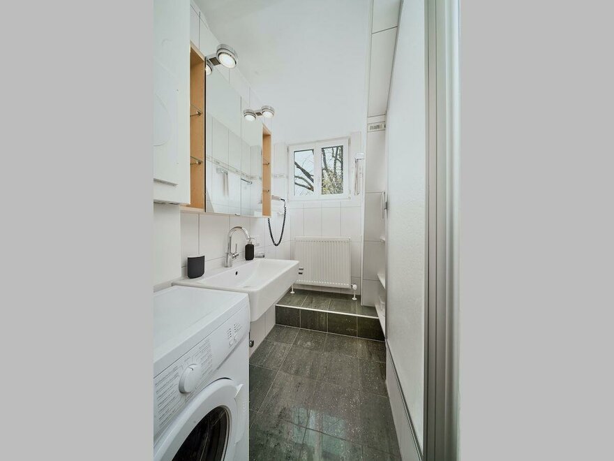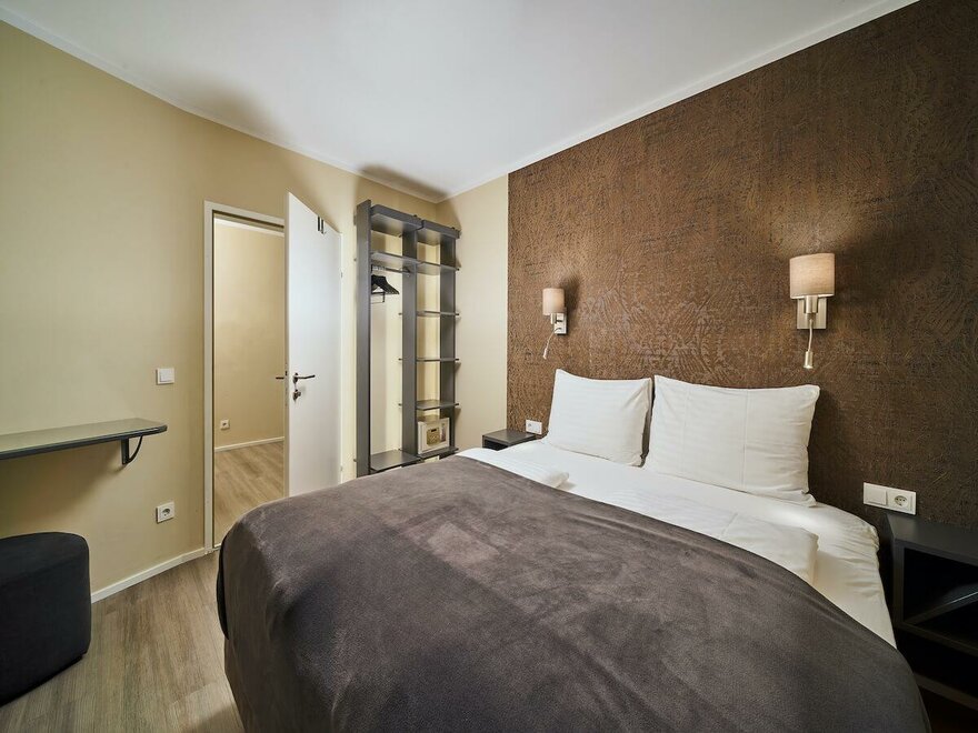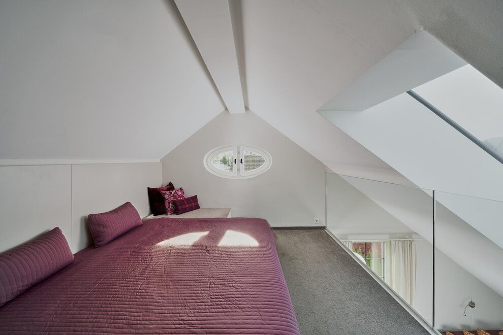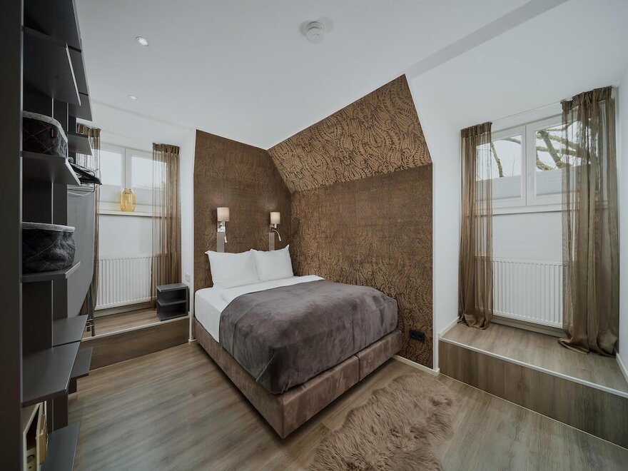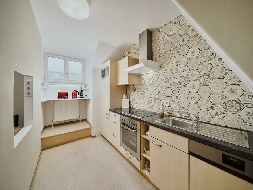 The Mozart 5 apartment is located in the attic and creates a unique living experience through individual details. The sloped ceilings and sandy tones immediately create a cozy atmosphere.