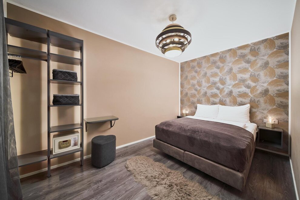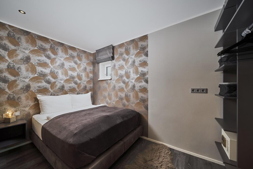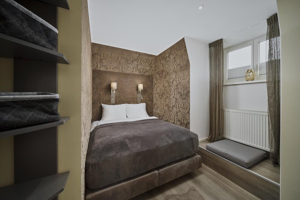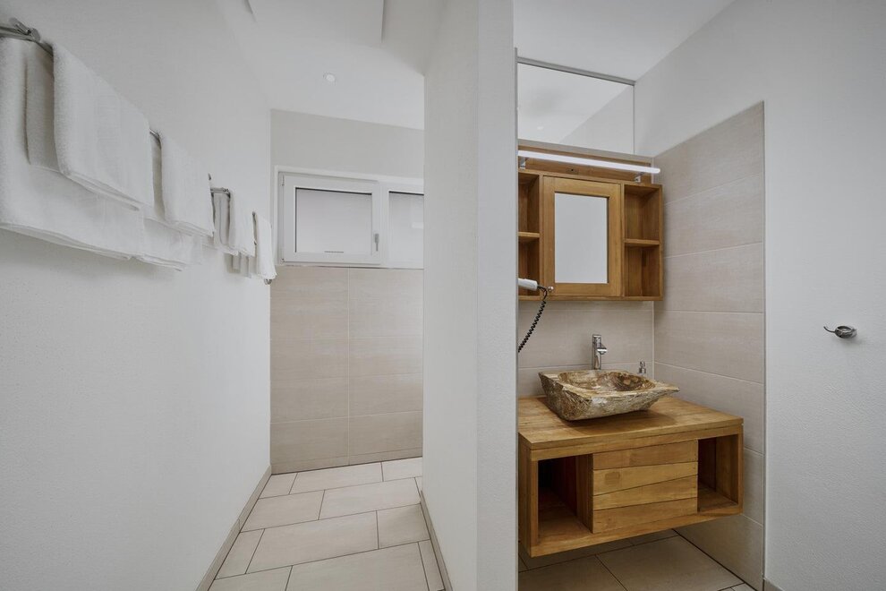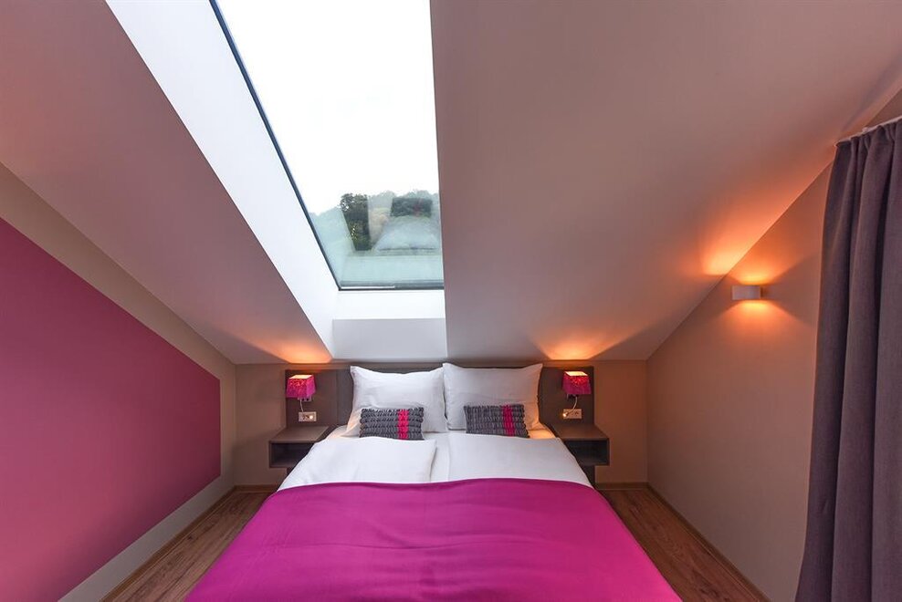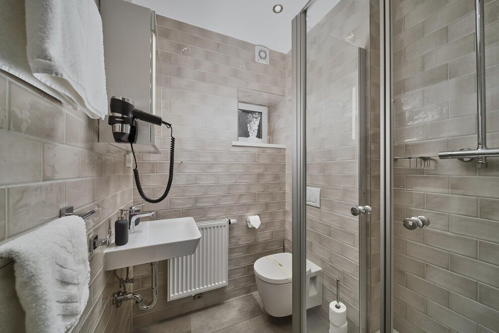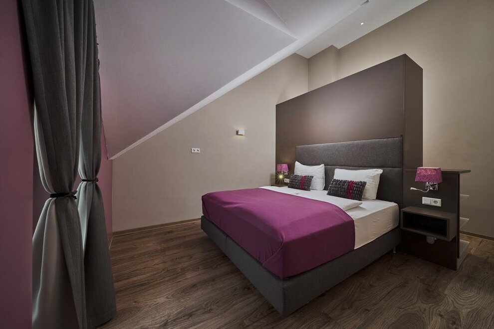 The Mozart 5 apartment is located in the attic and creates a unique living experience through individual details. The sloped ceilings and sandy tones immediately create a cozy atmosphere.
