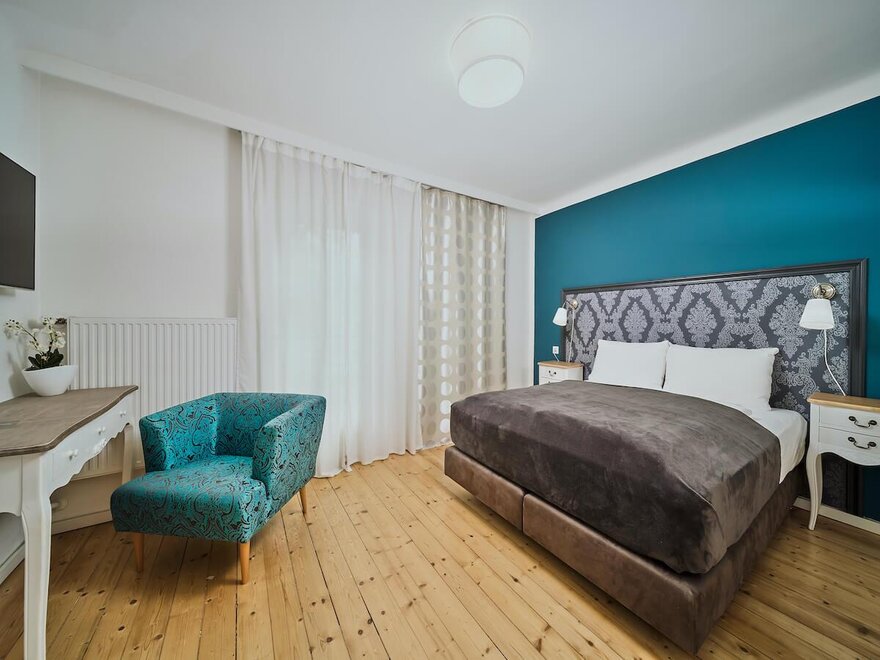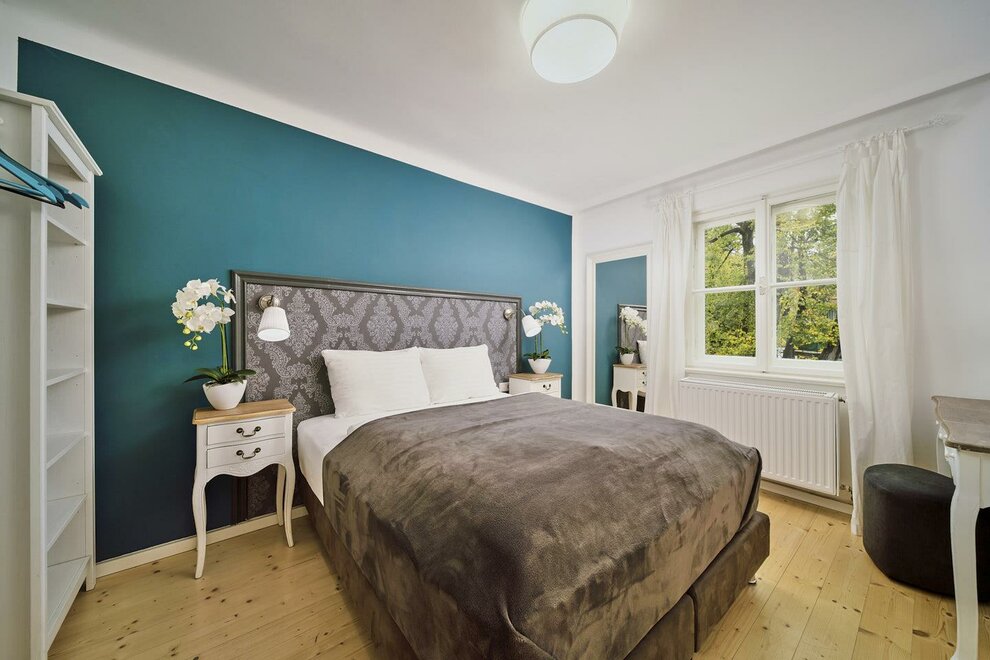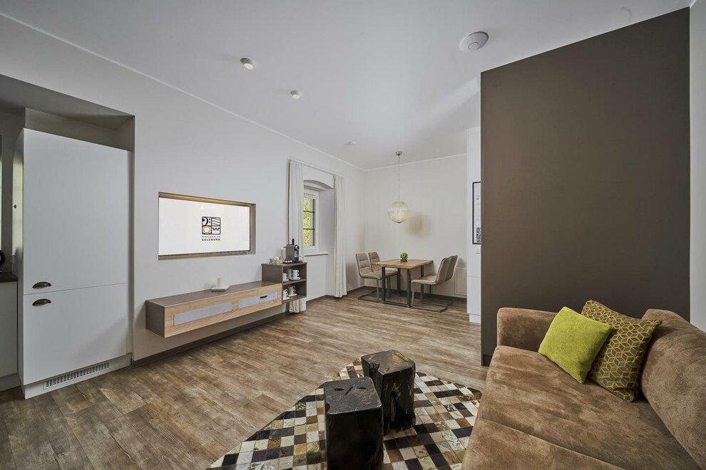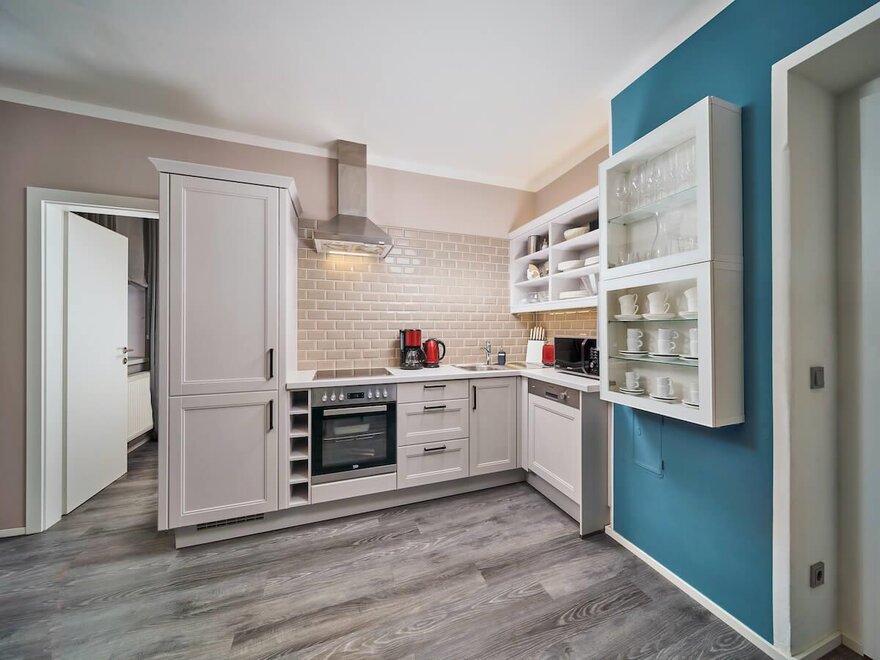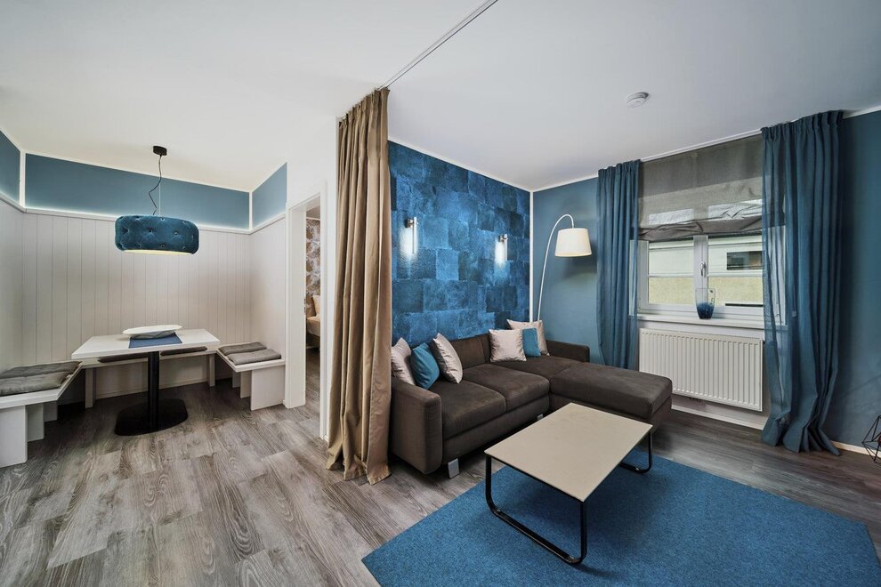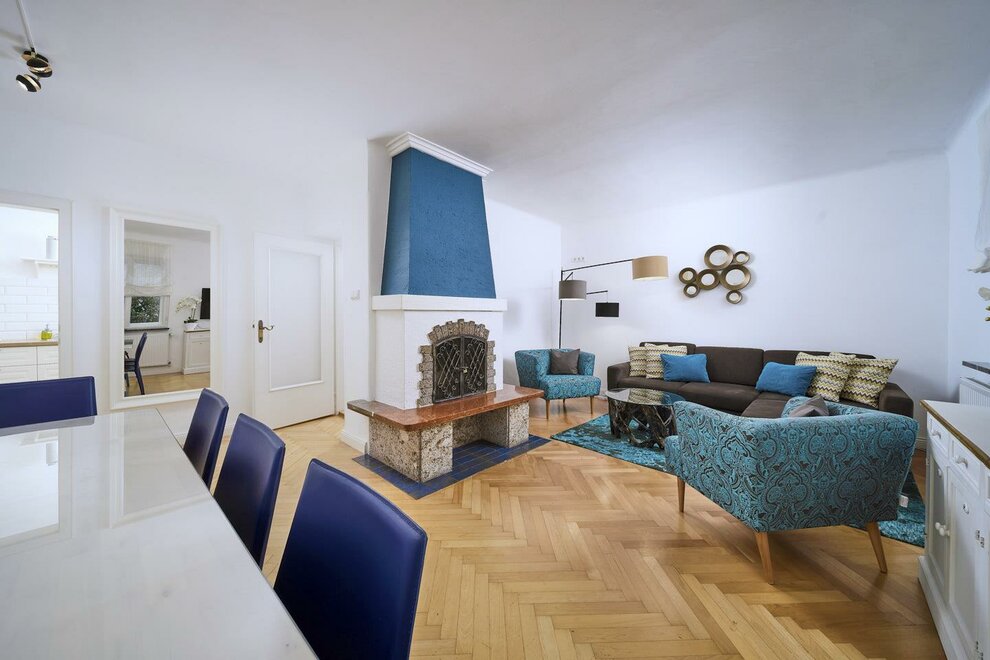 The apartment Mozart 3 impresses with a smart layout and turquoise-blue color accents. Spend your stay in Salzburg in the designer apartment.
