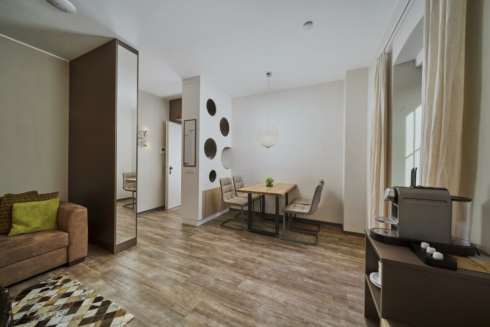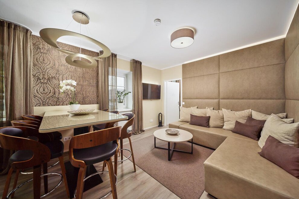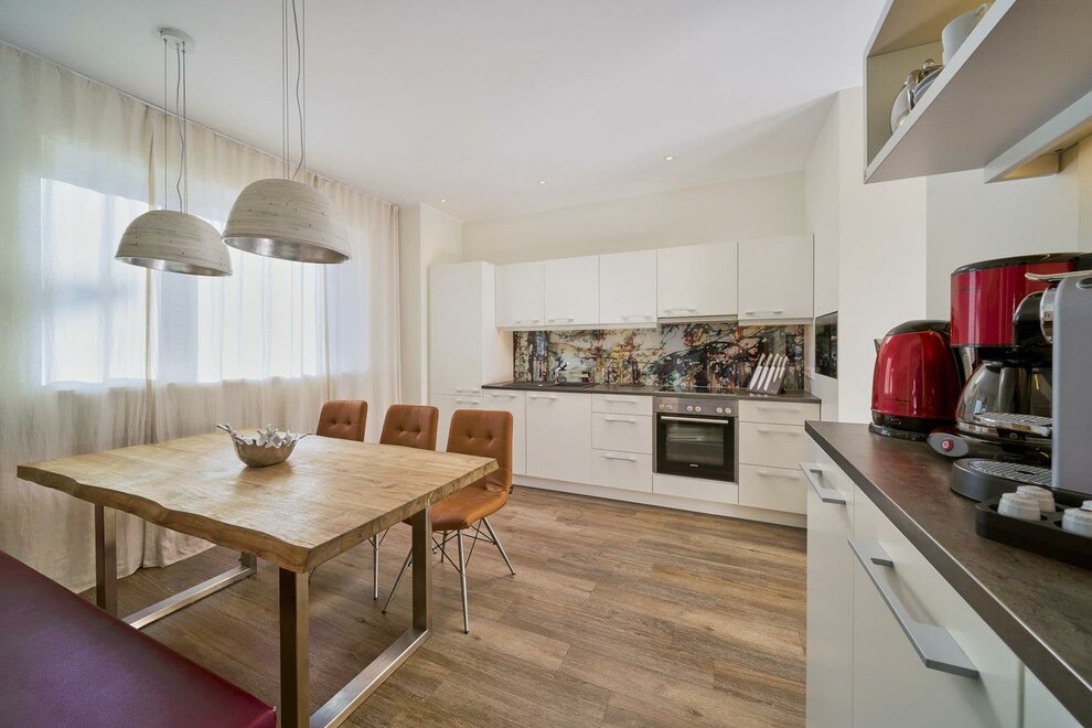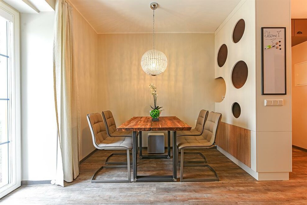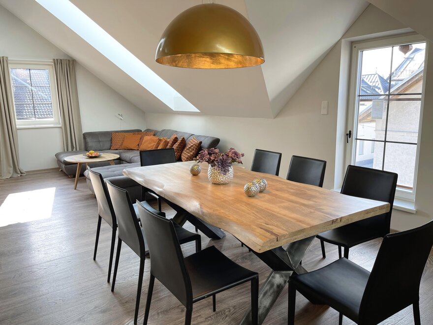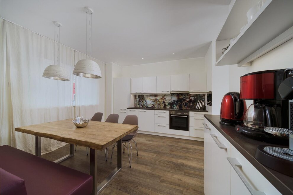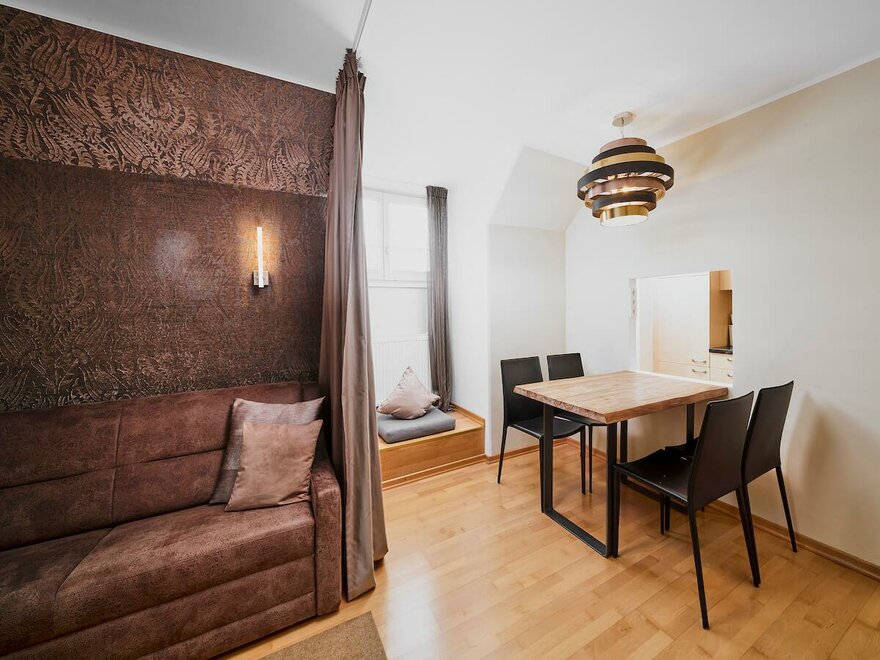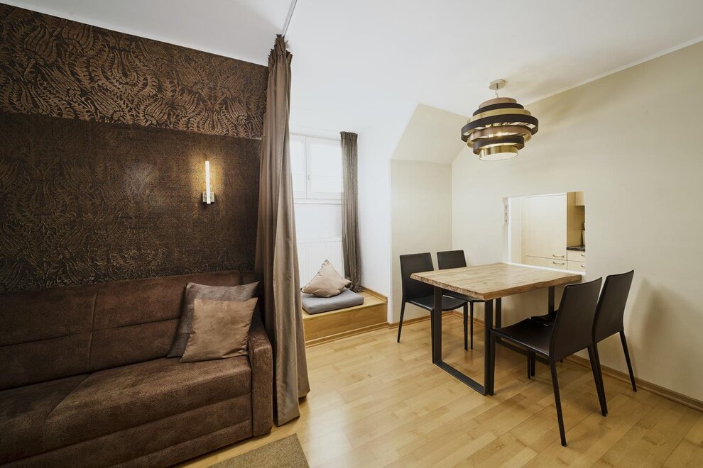 The apartment Mozart 2 is a combination of modern design, coziness, and quality. The dining area offers enough space for the whole family or a group of friends. The sofa bed can be separated from the kitchen area with a curtain.