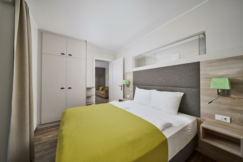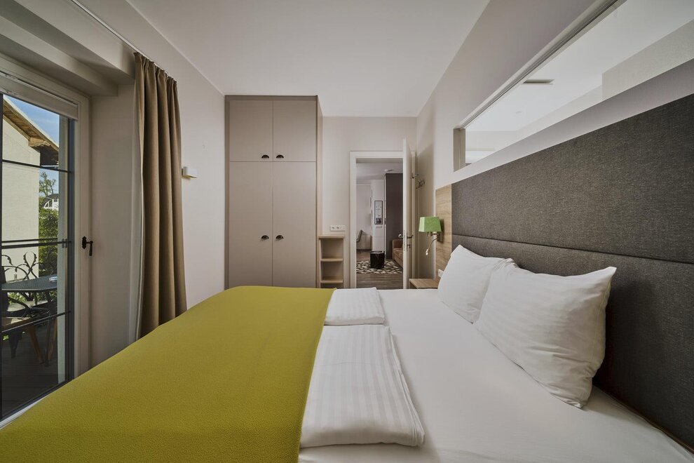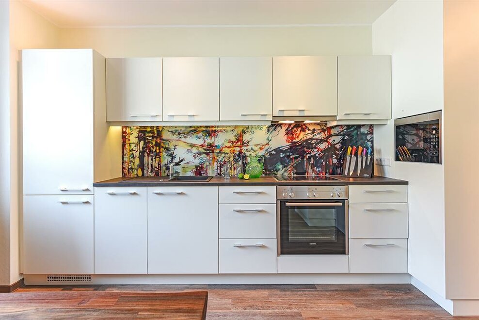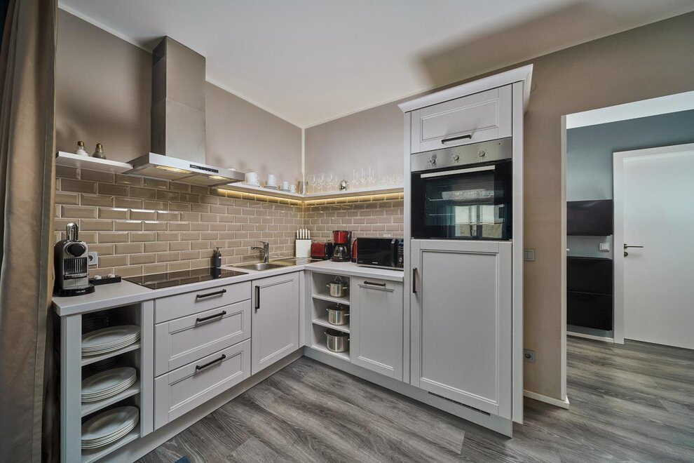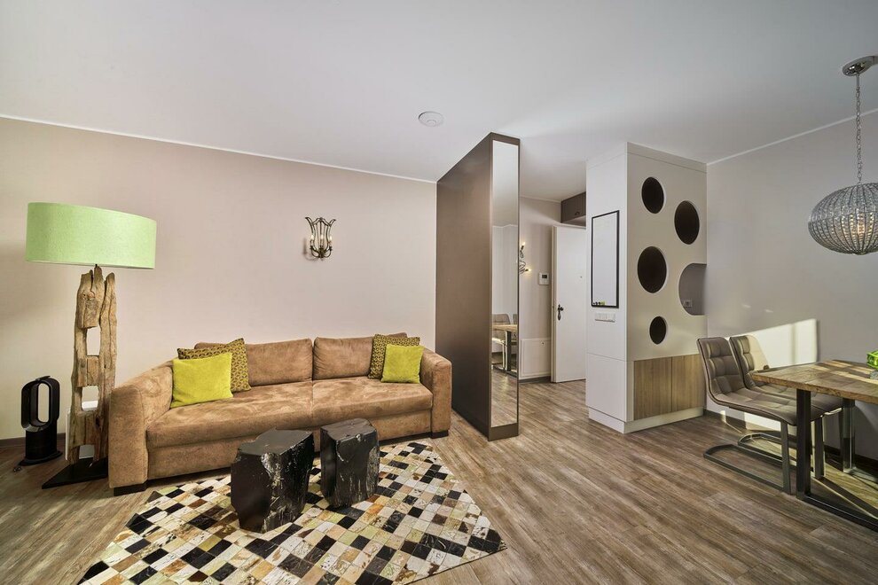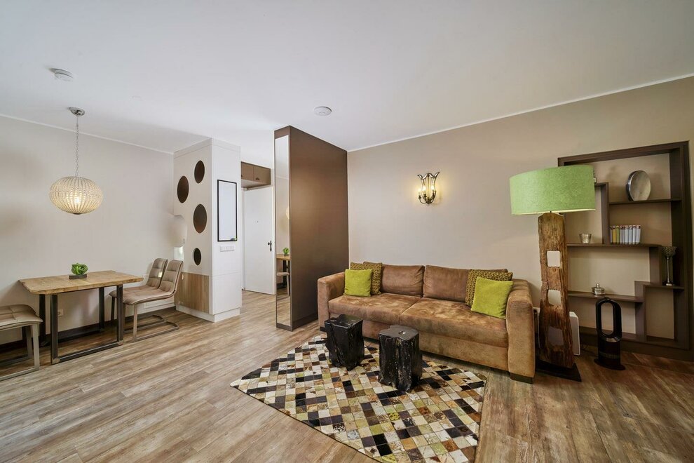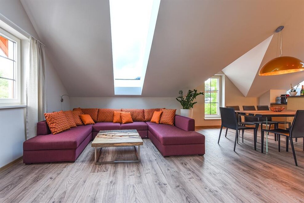 The apartment Mozart 2 is a combination of modern design, coziness, and quality. The dining area offers enough space for the whole family or a group of friends. The sofa bed can be separated from the kitchen area with a curtain.