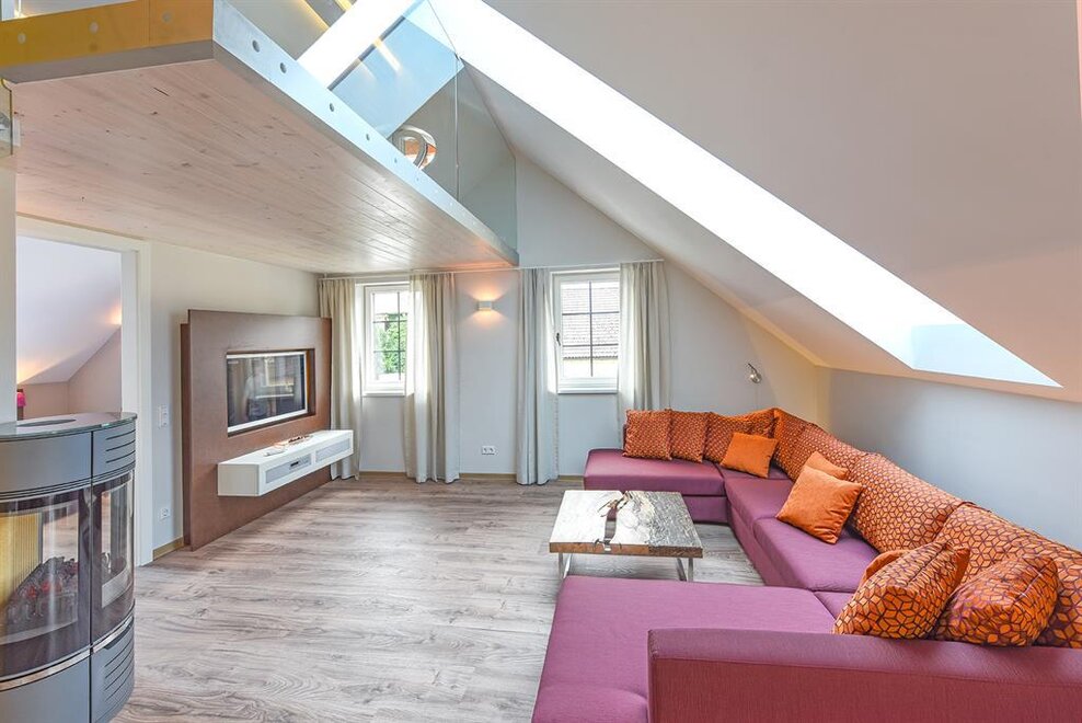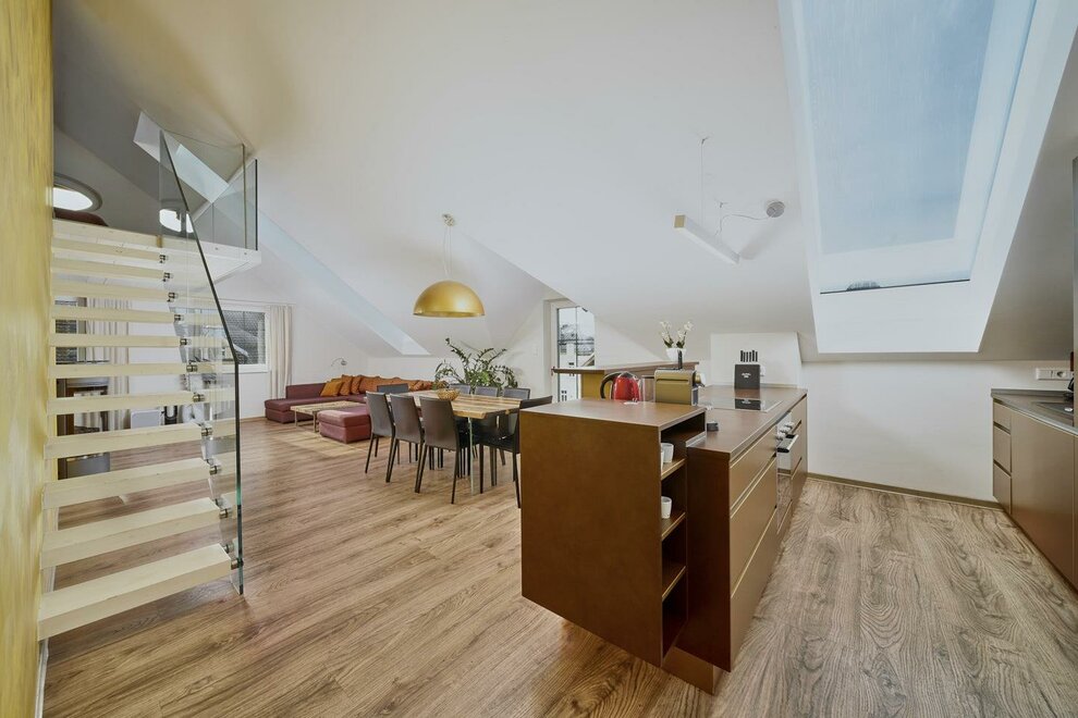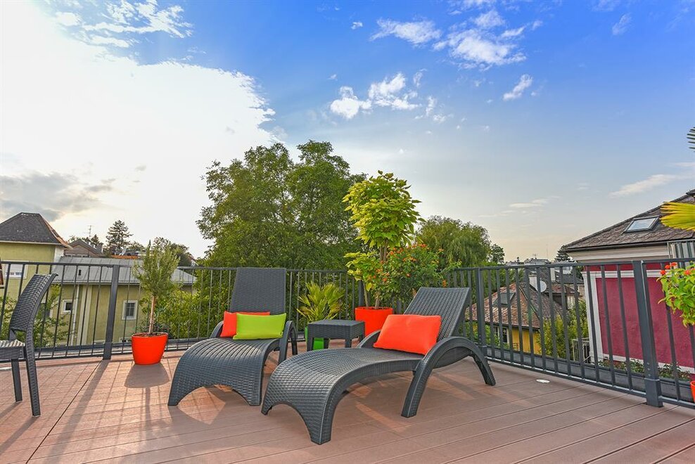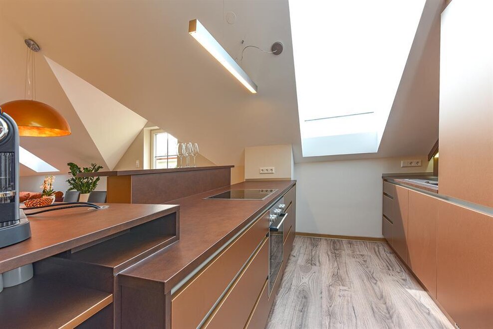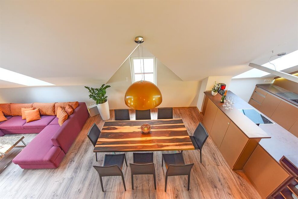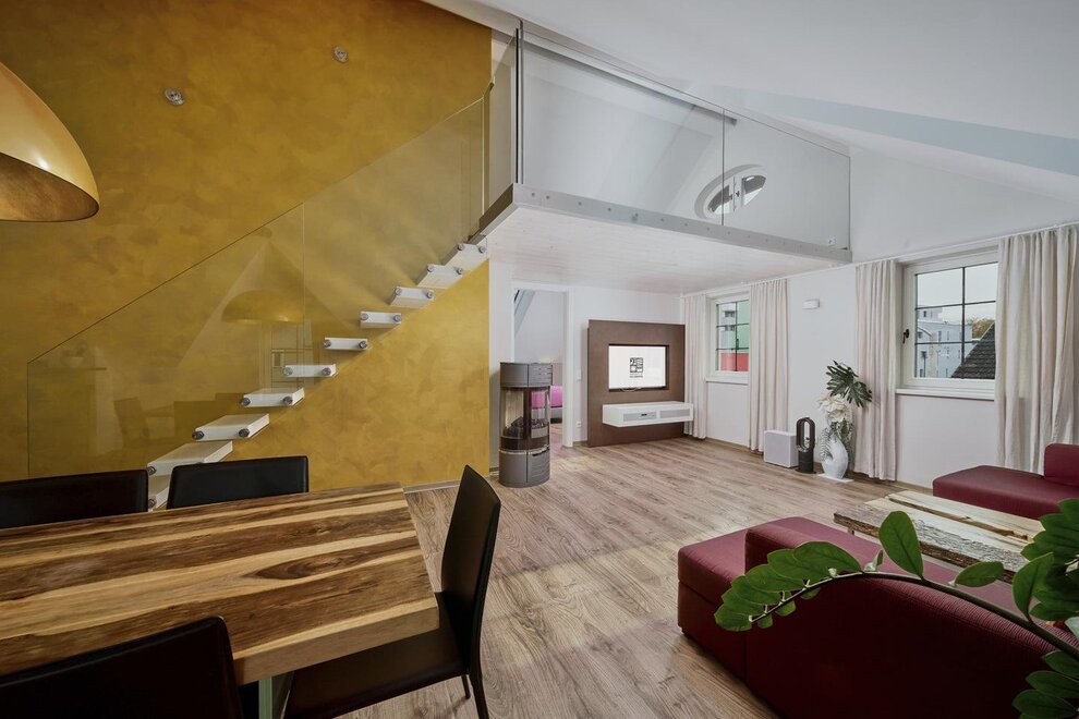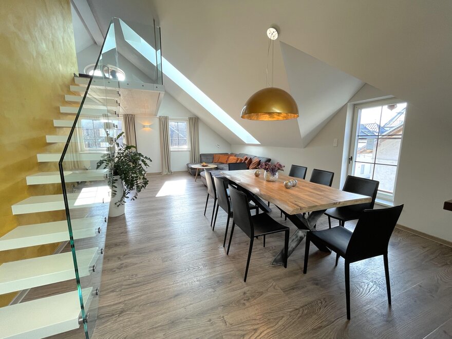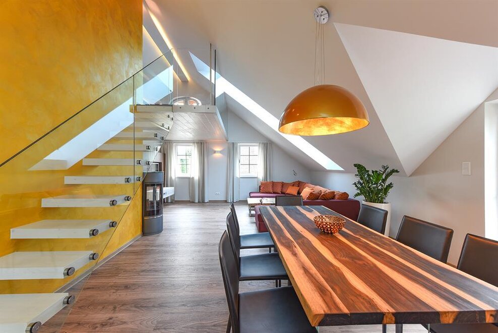 Festung Penthouse Our Festung penthouse is one of the best and most luxurious places to stay during your holiday in Salzburg. The apartment is spread over the entire top floor of Villa Salzburg and features up to 5 m high ceilings, designer furnishings and the highest quality materials. The combination of stately architecture and extravagant, modern design gives the penthouse a truly unique ambience. The penthouse is approx. 120 m² and includes 2 bedrooms with large double beds. The light-filled living room features large windows and wonderful views. The Danish fireplace in the living/dining area is perfect for cosy evenings in and the highlight in the bathroom is the freestanding bathtub placed directly under a 3.5 m² skylight. The penthouse also has a 10 m² chill-out mezzanine where you can relax with spectacular views of the Untersberg mountain. This is the perfect place for you to unwind and enjoy your holiday in Salzburg to the full. The penthouse at a glance Approx. 120 m² with up to 5 m high ceilings For 4-8 people 2 bedrooms with luxurious Boxspring double beds 1 additional double bed in the mezzanine High-quality hotel sofa bed in the living room for 2 additional guests Living room with large skylights and Danish fireplace Entertainment centre with stereo system and DVD & Blu-ray player Ultra HD flat screen TV with international channels via satellite (Astra) 10 m² chill-out mezzanine Fully equipped kitchen Bathroom with shower and freestanding bathtub, 3.5 m² skylight, 2 sinks, hairdryer, towels and infrared heating Separate toilet and urinal Safe Use of the villa’s sunny, 70 m² rooftop terrace with loungers and lounge furniture. Free WiFi Free parking The kitchen in detail WMF pots Berndorf cutlery Designer porcelain dinnerware Nespresso coffee machine Melitta toaster, coffee machine, hand blender and kettle Siemens kitchen appliances – stove, dishwasher, microwave, tall refrigerator with freezer compartment, etc. High chair and bottle warmer