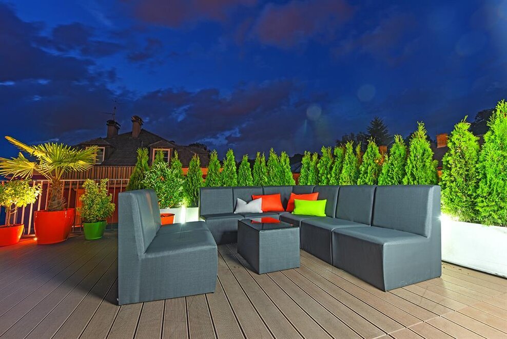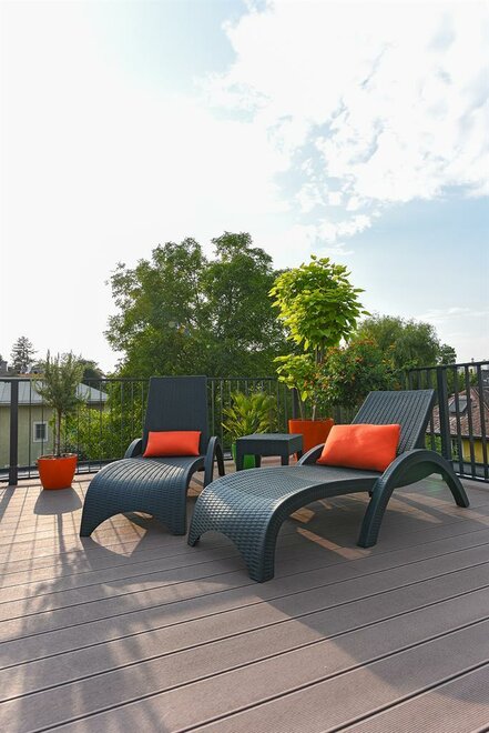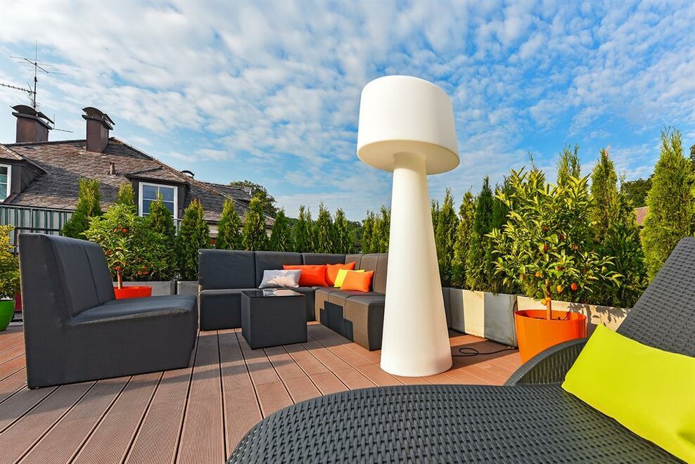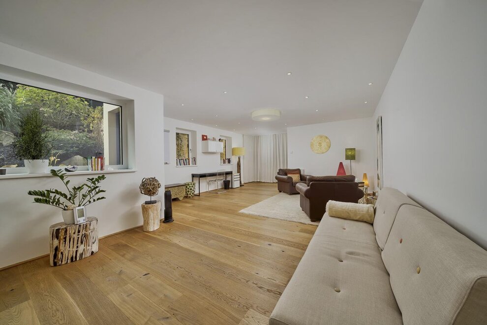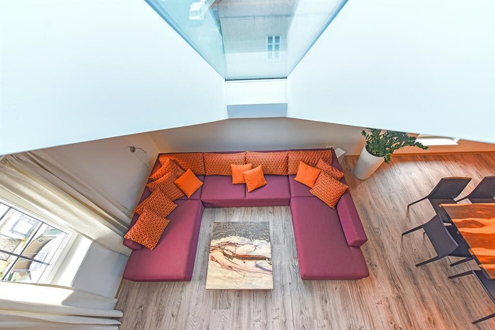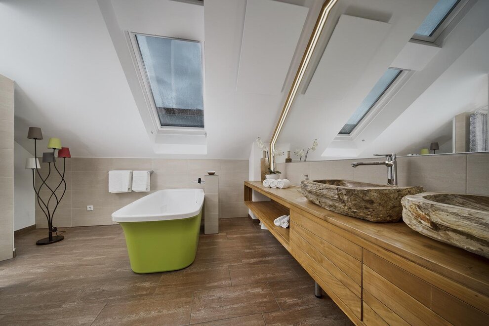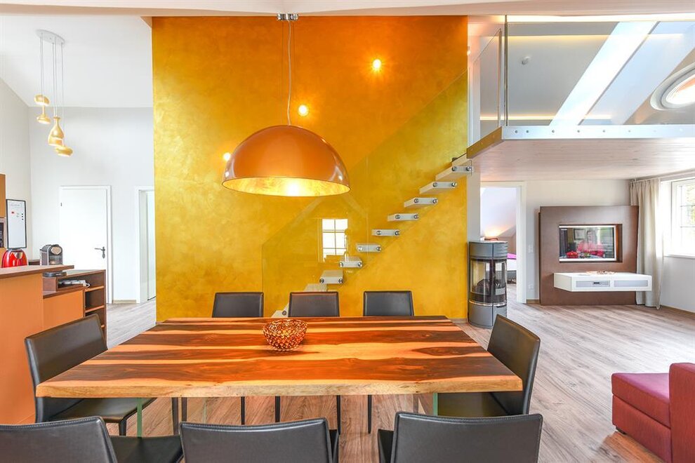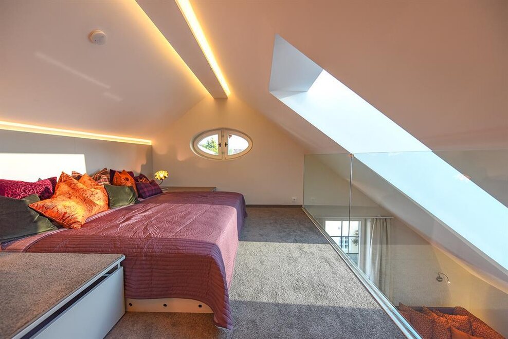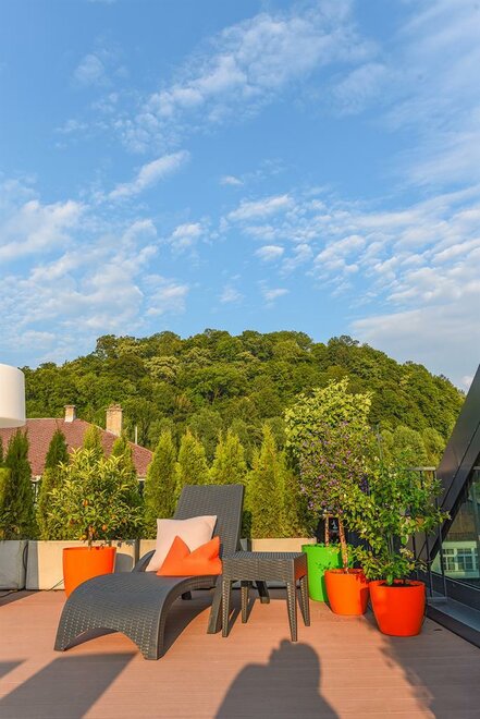 Festung Penthouse Our Festung penthouse is one of the best and most luxurious places to stay during your holiday in Salzburg. The apartment is spread over the entire top floor of Villa Salzburg and features up to 5 m high ceilings, designer furnishings and the highest quality materials. The combination of stately architecture and extravagant, modern design gives the penthouse a truly unique ambience. The penthouse is approx. 120 m² and includes 2 bedrooms with large double beds. The light-filled living room features large windows and wonderful views. The Danish fireplace in the living/dining area is perfect for cosy evenings in and the highlight in the bathroom is the freestanding bathtub placed directly under a 3.5 m² skylight. The penthouse also has a 10 m² chill-out mezzanine where you can relax with spectacular views of the Untersberg mountain. This is the perfect place for you to unwind and enjoy your holiday in Salzburg to the full. The penthouse at a glance Approx. 120 m² with up to 5 m high ceilings For 4-8 people 2 bedrooms with luxurious Boxspring double beds 1 additional double bed in the mezzanine High-quality hotel sofa bed in the living room for 2 additional guests Living room with large skylights and Danish fireplace Entertainment centre with stereo system and DVD & Blu-ray player Ultra HD flat screen TV with international channels via satellite (Astra) 10 m² chill-out mezzanine Fully equipped kitchen Bathroom with shower and freestanding bathtub, 3.5 m² skylight, 2 sinks, hairdryer, towels and infrared heating Separate toilet and urinal Safe Use of the villa’s sunny, 70 m² rooftop terrace with loungers and lounge furniture. Free WiFi Free parking The kitchen in detail WMF pots Berndorf cutlery Designer porcelain dinnerware Nespresso coffee machine Melitta toaster, coffee machine, hand blender and kettle Siemens kitchen appliances – stove, dishwasher, microwave, tall refrigerator with freezer compartment, etc. High chair and bottle warmer