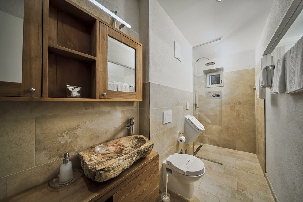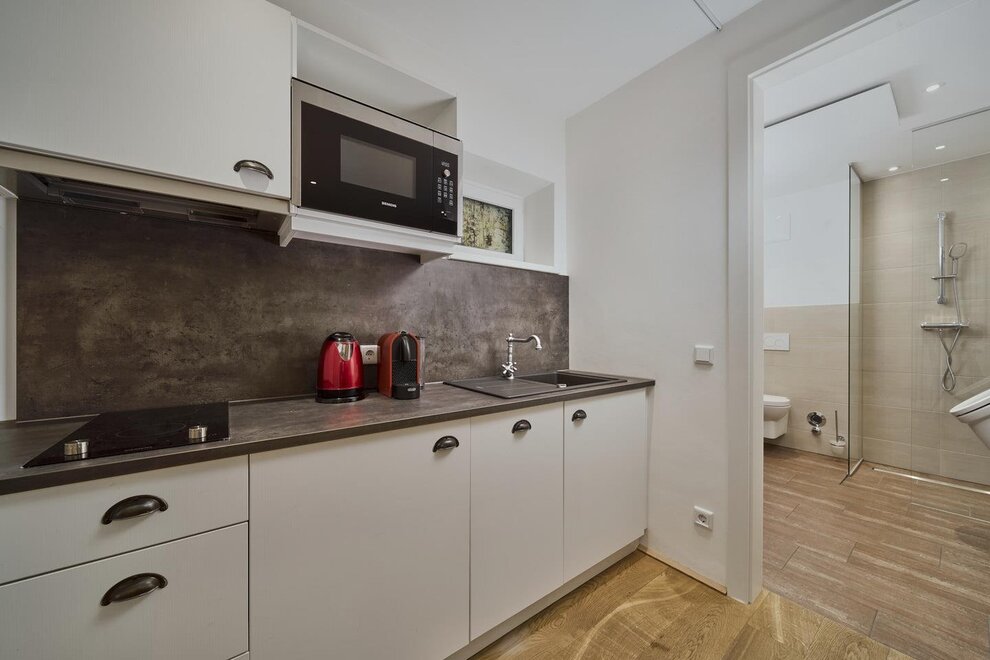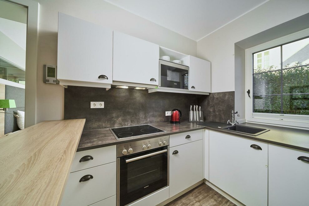 Apartment Mirabell Our Mirabell apartment is approx. 50 m² and offers truly elegant living. The holiday apartment is located in the newly renovated historic section of the villa and is furnished with premium furniture and exclusive materials. The apartment includes a spacious and comfortable open-plan kitchen/living room, a bedroom with double bed and a bathroom with shower, toilet and urinal. The high-quality hotel sofa in the living room can be converted into an extra bed for additional guests. Features of the Mirabell holiday apartment Approx. 50 m² For 2-4 people 1 bedroom with luxurious Boxspring double bed Comfortable open-plan kitchen/living room with high-quality hotel sofa bed for 2 people Entertainment centre with stereo system and DVD & Blu-ray player Ultra HD flat screen TV with international channels via satellite (Astra) Fully equipped kitchen Bathroom with shower, toilet, urinal, hairdryer, towels and infrared heating Safe Some include garden access or terrace Use of the villa’s sunny, 70 m² rooftop terrace with loungers and lounge furniture. Free WiFi Free parking The kitchen in detail WMF pots Berndorf cutlery Designer porcelain dinnerware Nespresso coffee machine Melitta toaster, coffee machine, hand blender and kettle Siemens kitchen appliances – stove, dishwasher, microwave, tall refrigerator with freezer compartment, etc. High chair and bottle warmer