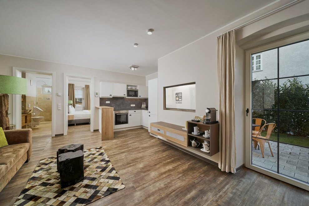 Apartment Hellbrunn Our Hellbrunn apartment is approx. 70 m² for your holiday enjoyment. The apartment features two bedrooms with double beds and a comfortable living room with a high-quality hotel sofa bed. The apartment also offers garden access or a balcony, as well as a fully equipped kitchen for your culinary enjoyment. Features of the Hellbrunn Holiday Apartment Approx. 70 m² For 4-6 people 2 bedrooms with luxurious Boxspring double beds Comfortable living room with a high-quality hotel sofa bed for 2 people Entertainment centre with stereo system and DVD & Blu-ray player Ultra HD flat screen TV with international channels via satellite (Astra) Fully equipped kitchen Bathroom with shower, hairdryer, towels and infrared heating Separate toilet and urinal Safe Garden access or terrace Use of the villa’s sunny, 70 m² rooftop terrace with loungers and lounge furniture. Free WiFi Free parking The kitchen in detail WMF pots Berndorf cutlery Designer porcelain dinnerware Nespresso coffee machine Melitta toaster, coffee machine, hand blender and kettle Siemens kitchen appliances – stove, dishwasher, microwave, tall refrigerator with freezer compartment, etc. High chair and bottle warmer