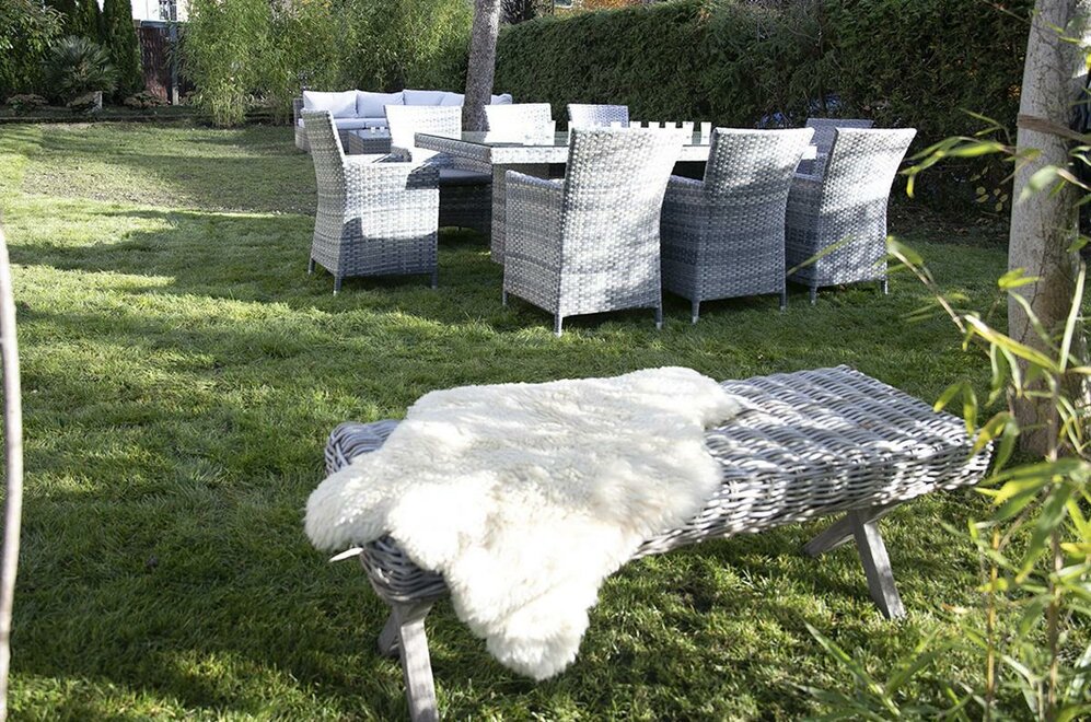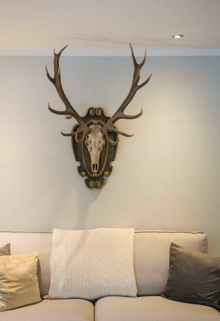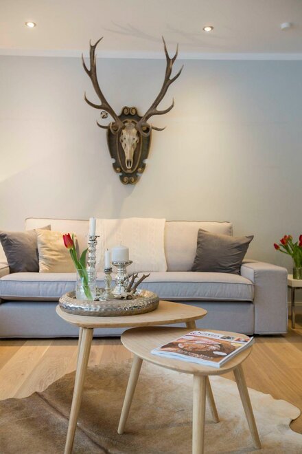 For a sunny breakfast under the open sky you’ll find a small terrace off the kitchen. After your excursions in Salzburger Land, you can relax at the open fireplace, in front of two cozy tiled stoves or the flat-screen TV. The leather sofas with original skins and hand-sewn upholstery are as inviting as the luxurious terrace with weatherproofed lounge furniture and sun loungers. There you can enjoy the impressive Salzburg panorama – indeed a dream setting at your feet.