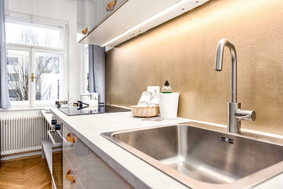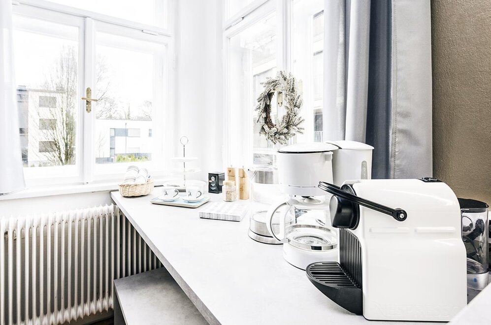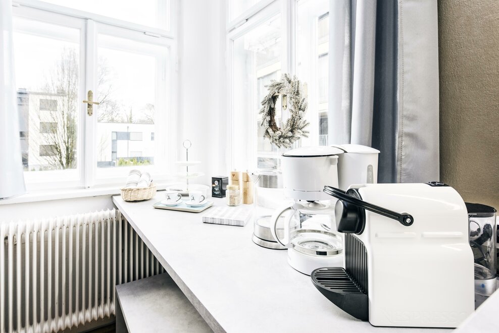 Past the wine cellar, a large, slightly curved staircase leads you to the first floor. There you have your grand living room and a dining room with an open, high quality kitchen including a small pantry. The kitchen offers all kinds of comfort - from a dishwasher, electric stove and oven to a microwave, coffee & tea machine, to a steamer and other highly practical gadets.