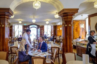 Right next to Bazar, is Café Sacher, where guests can enjoy the same wonderful view of the Old Town. The world-famous Sacher Torte or other masterpieces from their patisserie can be paired with traditional coffee and tea specialities. The exquisite Salzburger Nockerl [sweet egg-white soufflé] are served with raspberry sauce and presented on an elegant serving trolley. If you prefer something savoury, the legendary Sacherwürstel [long Frankfurter sausages] are definitely the way to go.