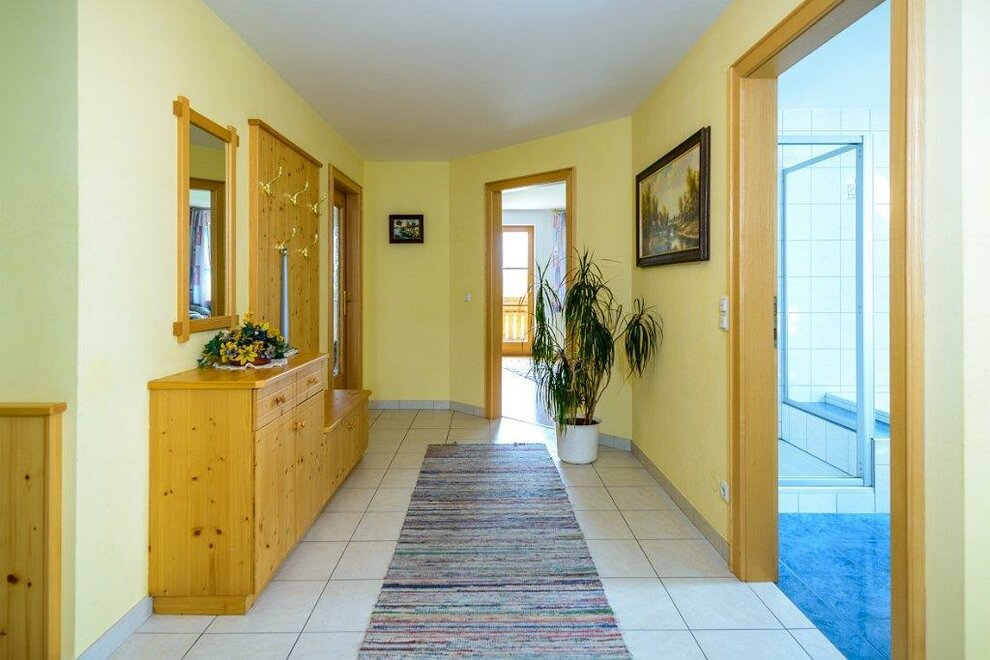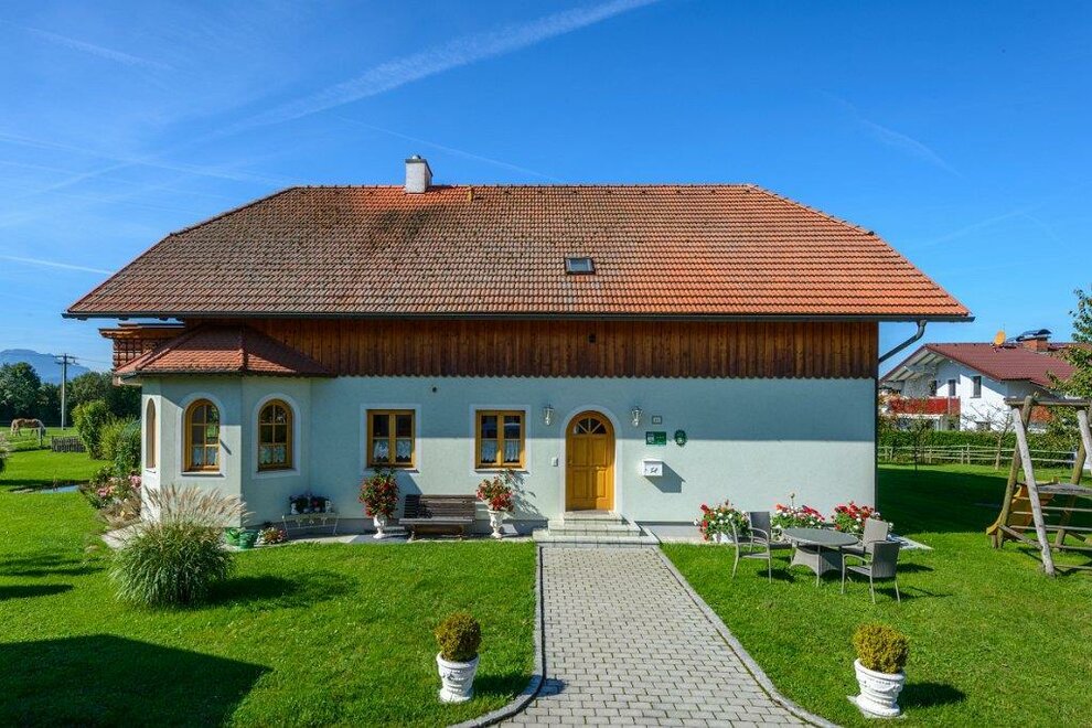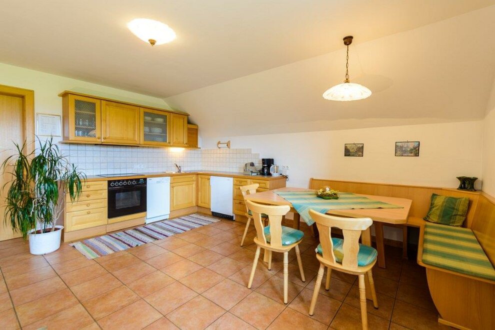 Spacious apartment for up to 6 guests on the first floor. The furniture is made of untreated solid wood. Two bedrooms and cot (crib), modern kitchen, Living room with Sat-TV and radio, couch and table. Bathroom with shower and bathtub, separated toilet. Large balcony with seating set.