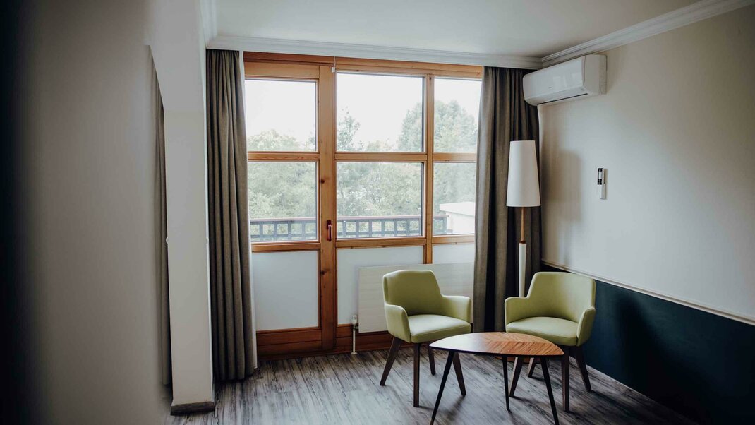 La chambre confortable élégante dispose de deux lits, d'un balcon avec vue sur le parc pittoresque, de la climatisation, d'une machine à café NEPRESSO, de la télévision par câble et du Wi-Fi. La salle de bains entièrement équipée avec douche procure un confort supplémentaire.