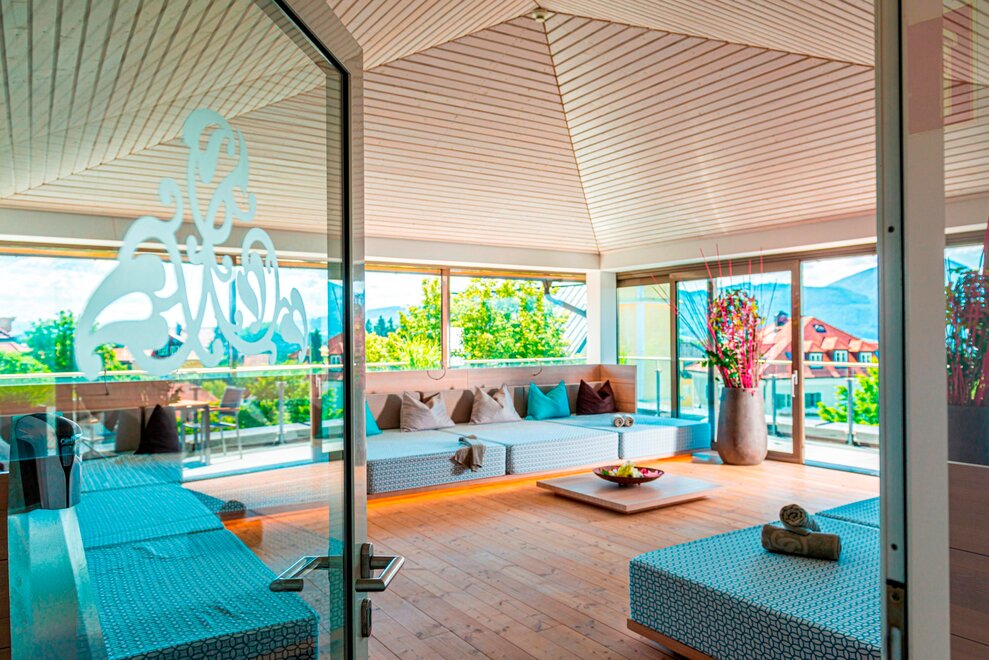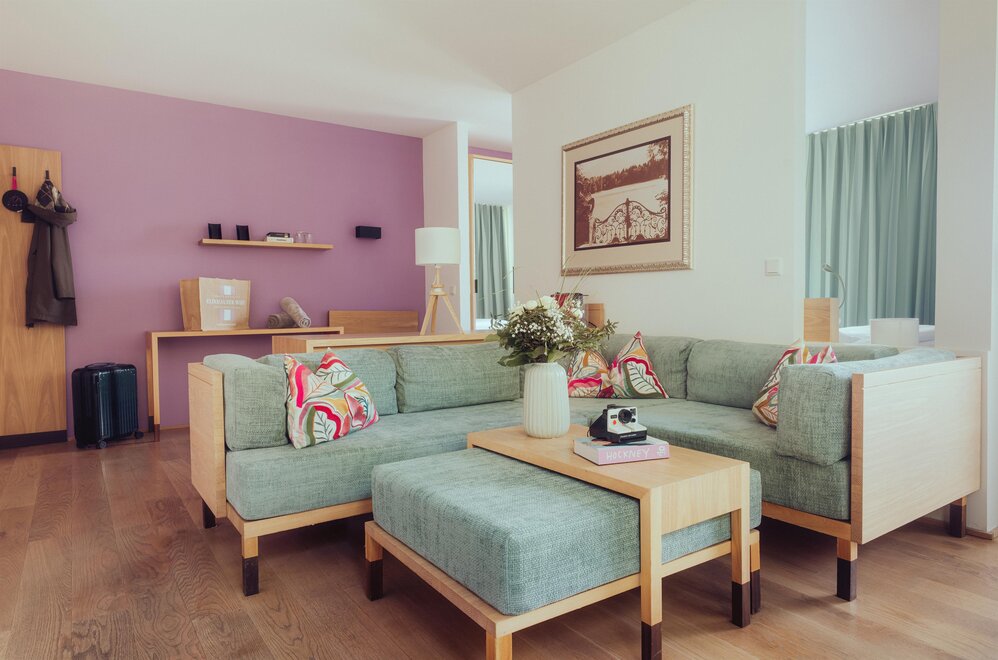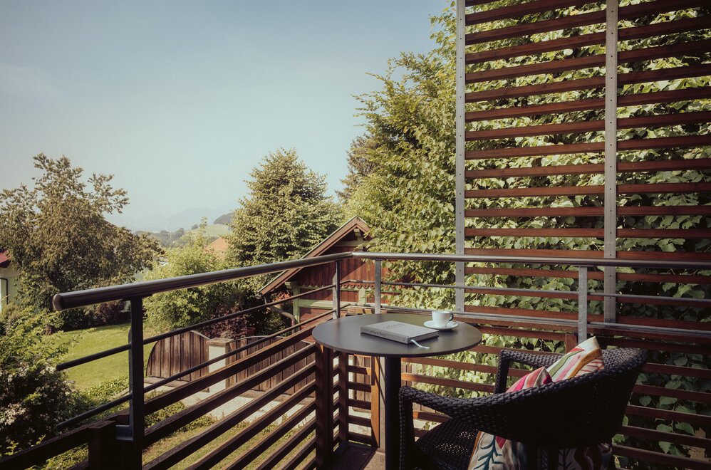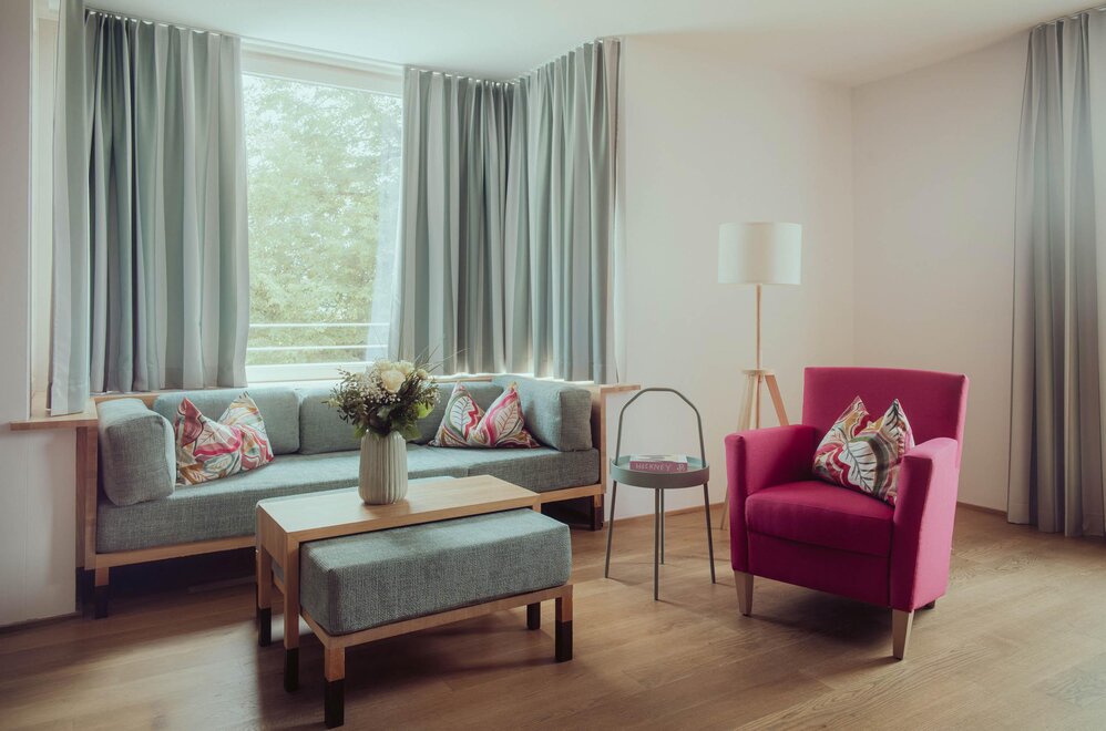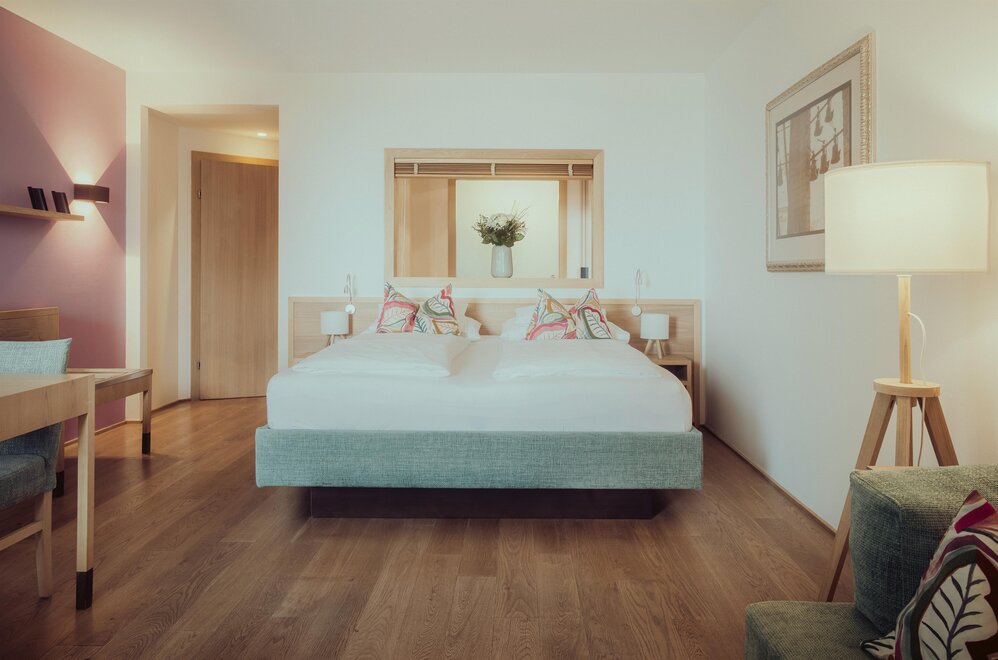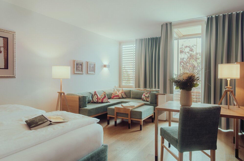 Junior Suite in the "Klosterhof" building with panoramic mountain view, approximately 40 m², bathroom with bath tube/ toilet and hairdryer, scale, lounge corner, partial balcony or terrace, mini-bar, safe, wake-up service, free WLAN, telephone and flat screen with cable TV including Sky.