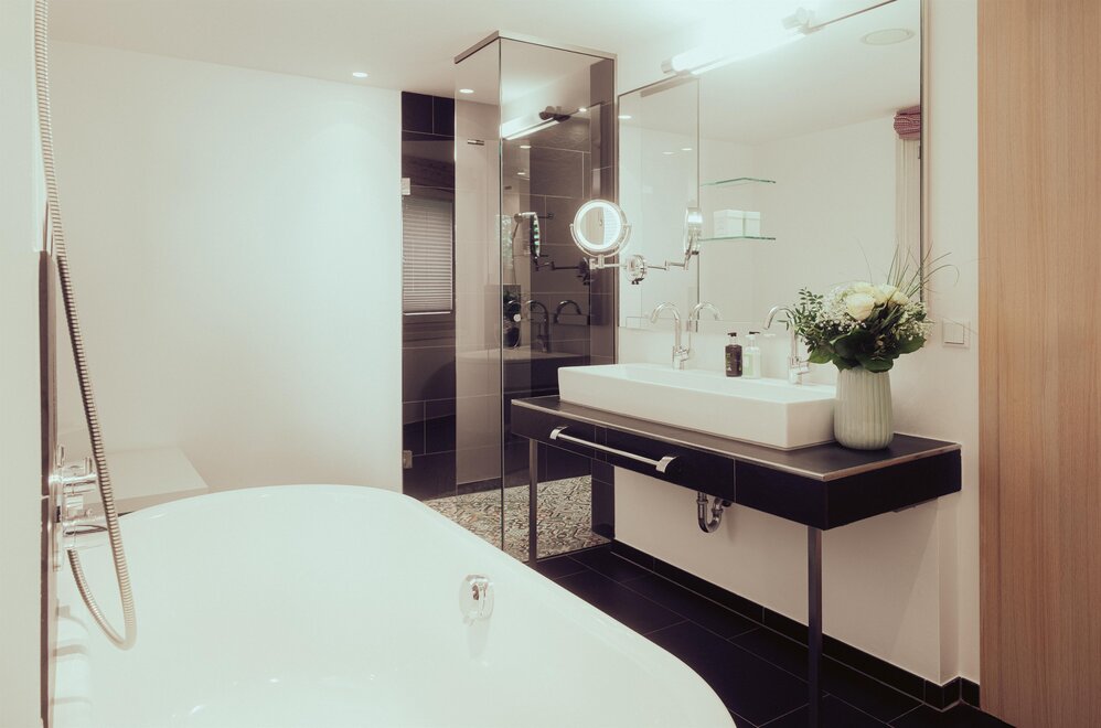 Bright and very spacious loft in modern design, paired with classic elegance, located in the main building; pure luxury and a feel-good atmosphere over approximately 60 m² with comfortable armchairs, a cozy seating area or comfortable couch, and a practical desk; semi-open bathroom with bathtub, double sink, and shower as well as a hairdryer, personal scale, and selected toiletries; separate toilet; free Wi-Fi, USB socket, and air conditioning, telephone, flat-screen TV with cable TV including Sky and radio; safe.