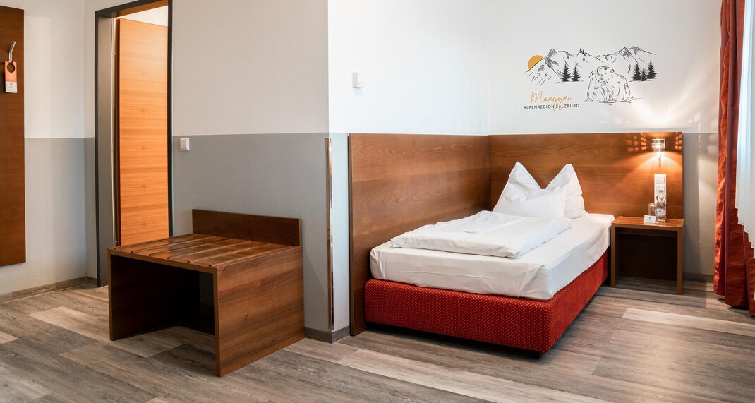 Modern and comfortabe double or twin room also for single use with soundproof windows. Baby bed or additional bed on request. A great view to forest and mountains.