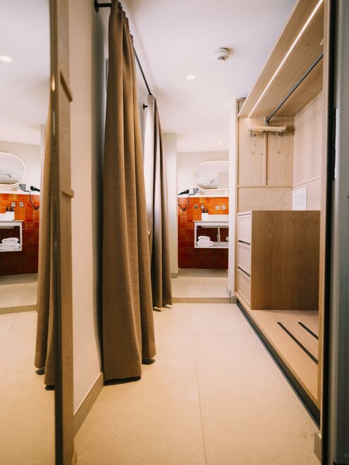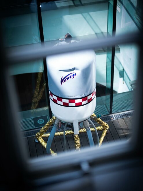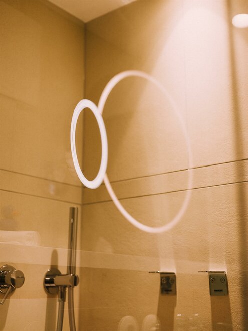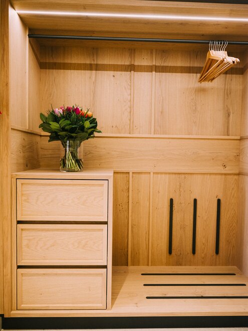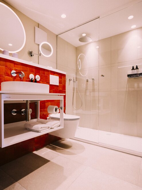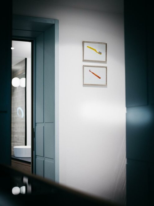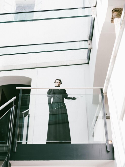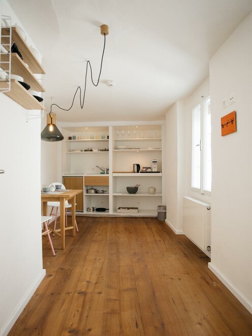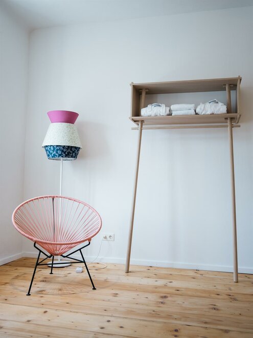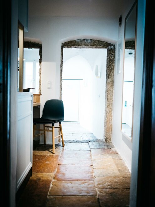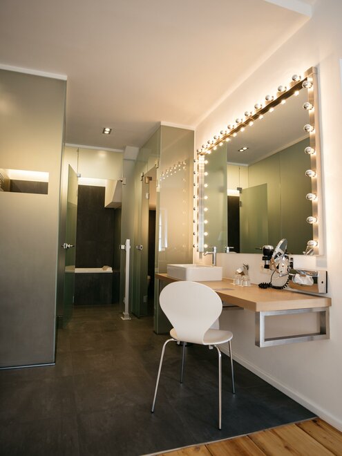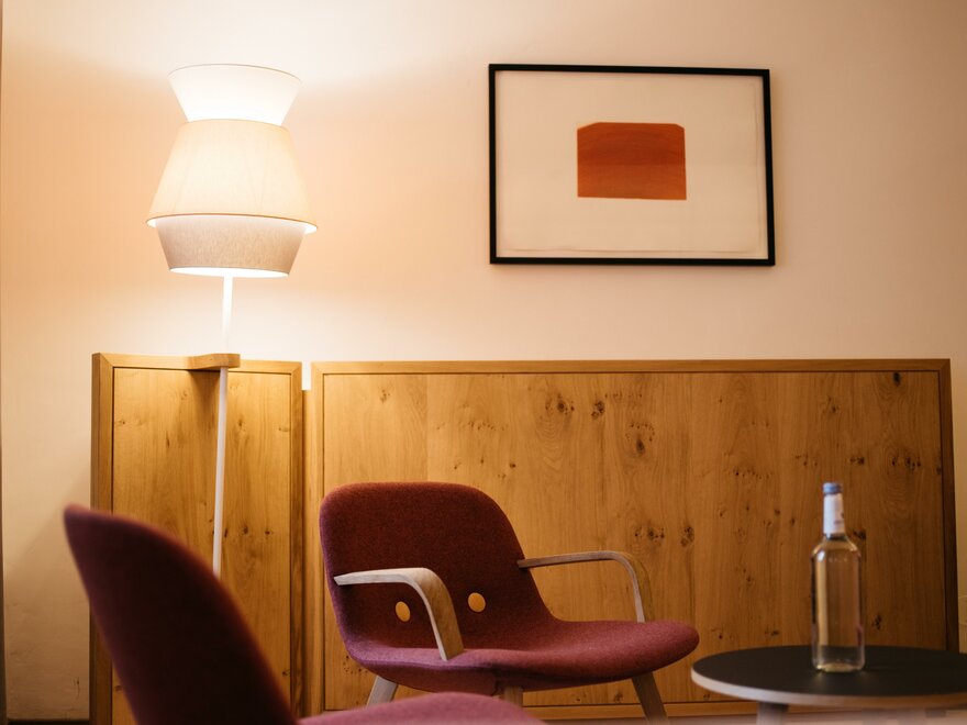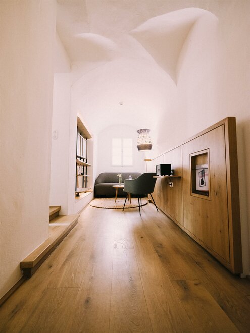 Мезонет Сьюит | Свободное Пространство | Искусство | городской погружение Разве мы не все звезды? Наш мезонет сьюит предлагает свободное пространство площадью 115 м², разделенное на два этажа. Спальню мы разместили в историческом чердаке, где можно чудесно спать в тишине. На нижнем этаже находится гостиная, небольшая дополнительная комната для третьего человека, из которой - если вы хотите - также может получиться небольшая кухня, которую также можно спрятать. В ванной комнате с отдельным душем и ванной, а также отдельным туалетом много места, а гардеробная напоминает просторную артистическую гримерку. Старые деревянные полы и красивые сводчатые потолки создают уютную атмосферу. Конечно, есть телевизор с плоским экраном, DVD плеер, стереосистема, кондиционер и мини-бар. Небольшая лестница ведет из коридора в сьюит. В рамках нашей серии "Артист в Резиденции" мезонет-сьюит была доступна Ирине Андесснер ("I.A. Моцарт?") и Сизалю Микели ("Парящие попытки").