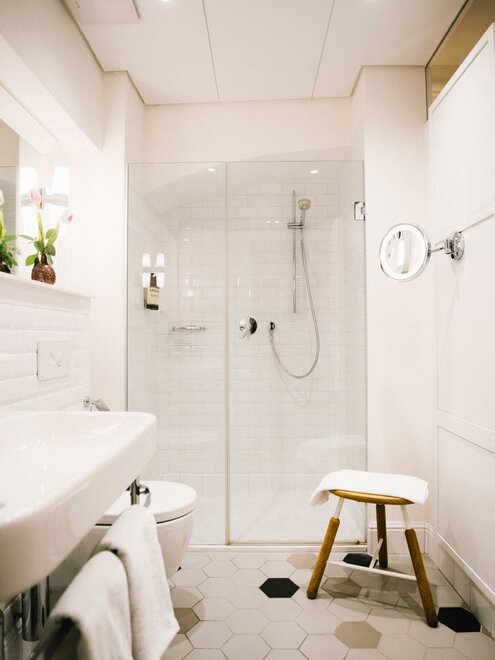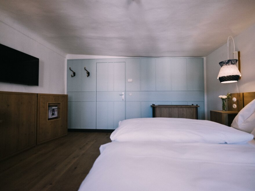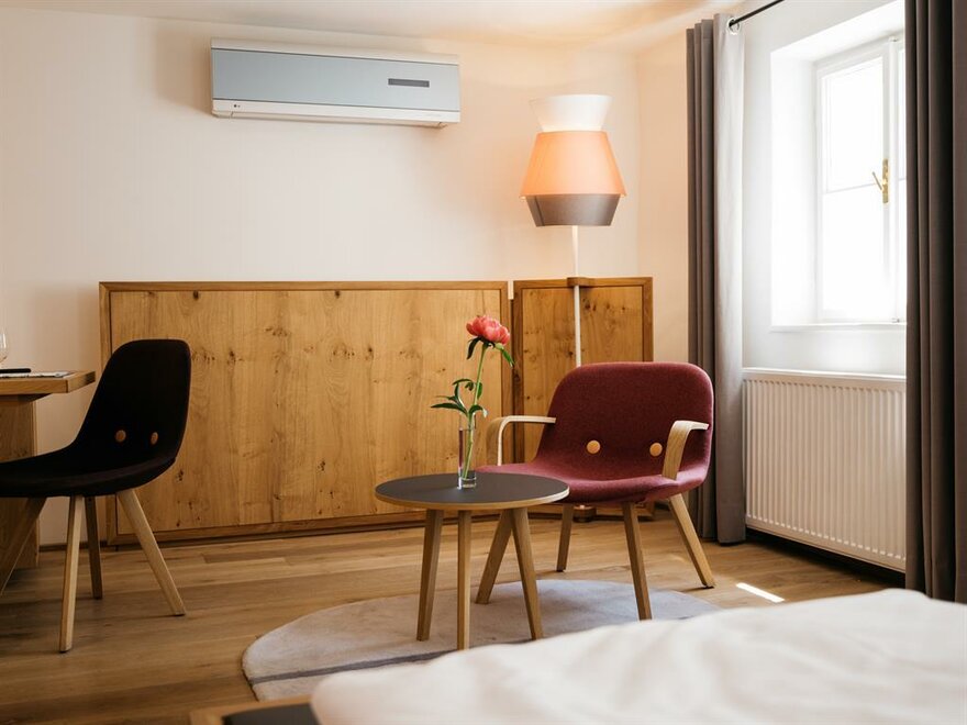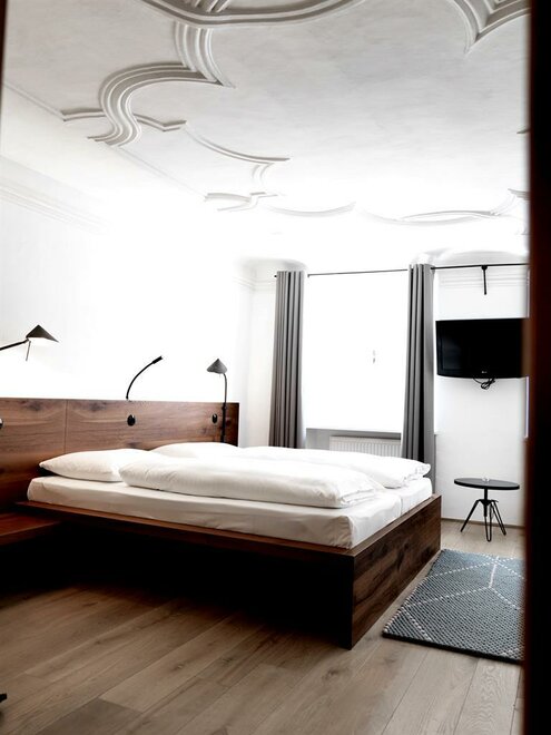 Двухместный номер "large" | Вдохновение | Жизнь в центре "Large"-комнаты, помимо их определенной щедрости, всегда также являются архитектурной особенностью. Некоторые имеют лепные потолки, некоторые - потолки с балками, над некоторыми простирается свод, другие находятся прямо под крышей. Каждая "Large" - это уникат! Двуспальная кровать, диван и/или кресло, письменный стол, ванная комната с отдельным туалетом, прямой телефон, фен, мини-бар, телевизор с плоским экраном и спутниковым телевидением, кондиционер. Все номера имеют различное оборудование.